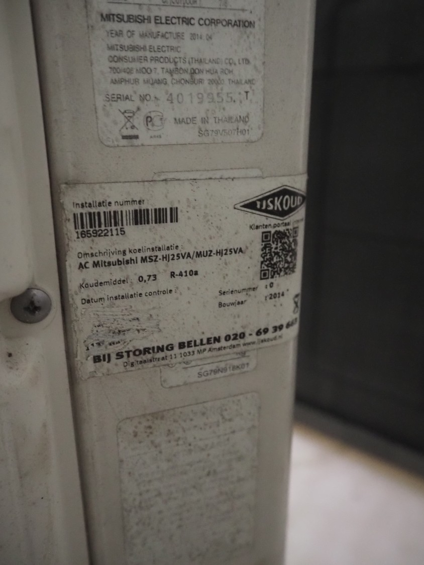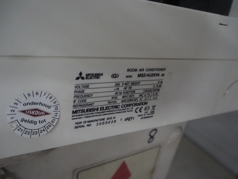 Mitsubishi inside and outside air conditioning unit, type outside unit: MUZ-HJ25VA, 230 V, 50 Hz, dimensions: 800 mm x 300 mm x 230 mm, type inside unit: MSZ-HJJ25VA, serial number: 3005028, year of construction: 2013, 230 V, 50 Hz, refrigerant: R410A, dimensions: 700 mm x 270 mm x 530 mm.