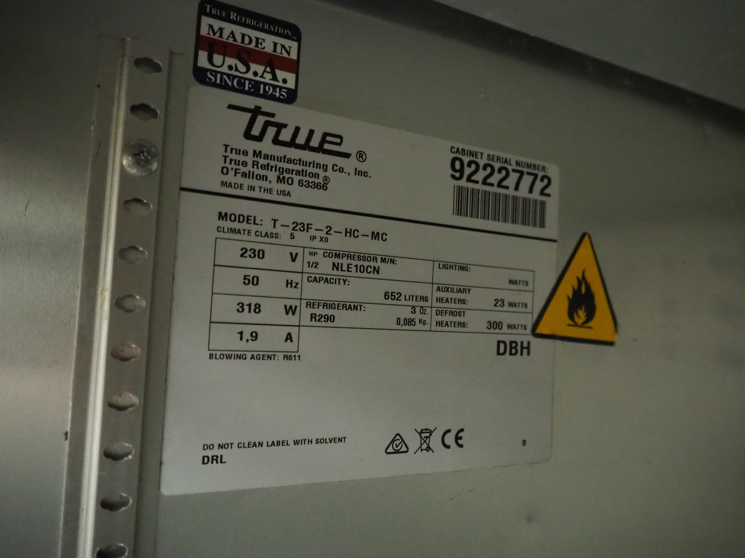 True Manufacturing Co., Inc. mobile refrigerator, model: T-23F-2-HC-MC, serial number: 9222772, 230 V, 50 Hz, 1.9 A, refrigerant: R290, dimensions: 750 mm x 680 mm x 2120 mm.