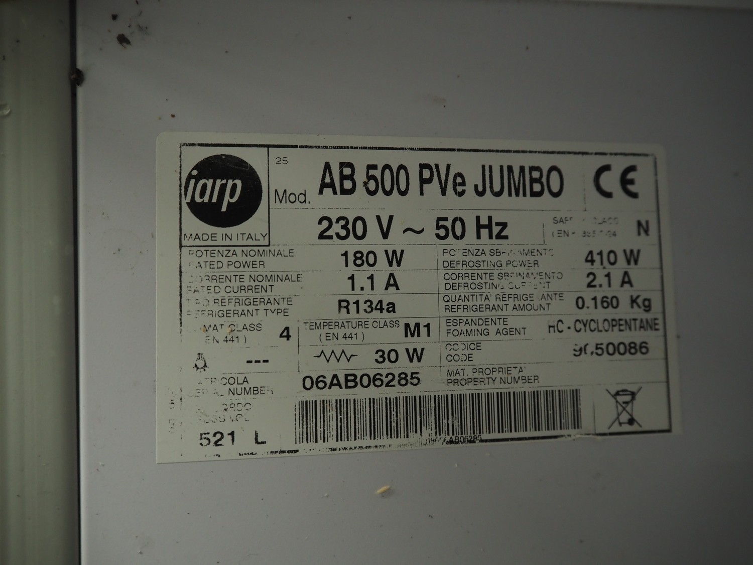 Iarp refrigerator, model: AB 500 Pve JUMBO, 230 V, 50 Hz, 180 W, refrigerant: R134a/0.160kg, dimensions: 750 mm x 720 mm x 1800 mm.