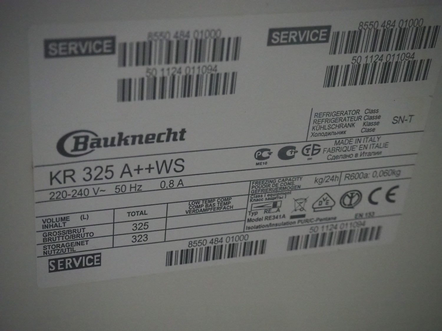 Bauknecht refrigerator, model: KR 325 A++WS, 220-240 V, 50 Hz, 0.8 A, volume: 325 liter, refrigerant: R600a / 0.060 kg, dimensions: 640 mm x 600 mm x 1600 mm.