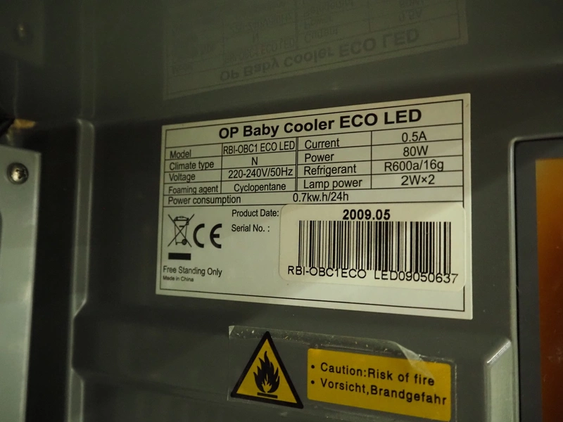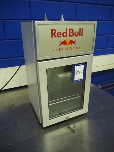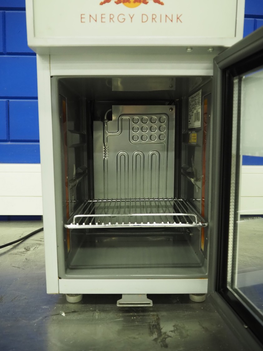 Red Bull refrigerator, model: RBI-OBC1 ECO LED, serial number: RBI-OBC1ECO LED09050637, year of construction: 05.2009, 220/240 V, 50 Hz, 0.5 A, 80 W, refrigerant: R600a, 16 g, 1 floor, floor dimensions: 200 mm x 220 mm, total dimensions: 360 mm x 300 mm x 580 mm.