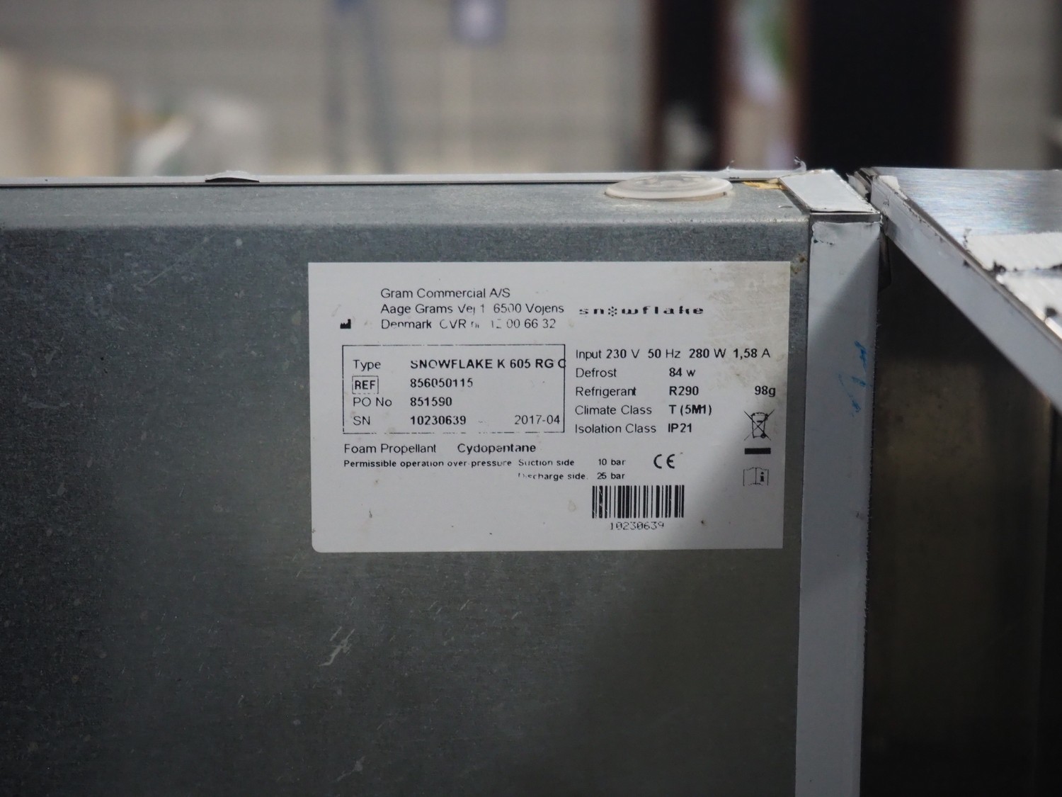 Gram Commercial A/S refrigerator, type: SNOWFLAKE K 605 RGC, serial number: 10230639, year of construction: 2017, 230 V, 50 Hz, 280 W, 1.58 A, refrigerant: R290/98 g, dimensions: 8 floors, dimensions: (8x) 650 mm x 520 mm, total dimensions: 870 mm x 700 mm x 2000 mm.