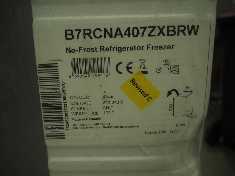 Beko No-Frost refrigerator/freezer, type: B7RCNA407ZXBRW, 220-240 V, dimensions: 600 mm x 750 mm x 2100 mm.