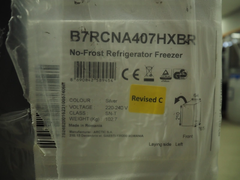 Beko No-Frost refrigerator/freezer, type: B7RCNA407HXBR, 220-240 V, dimensions: 600 mm x 750 mm x 2100 mm.