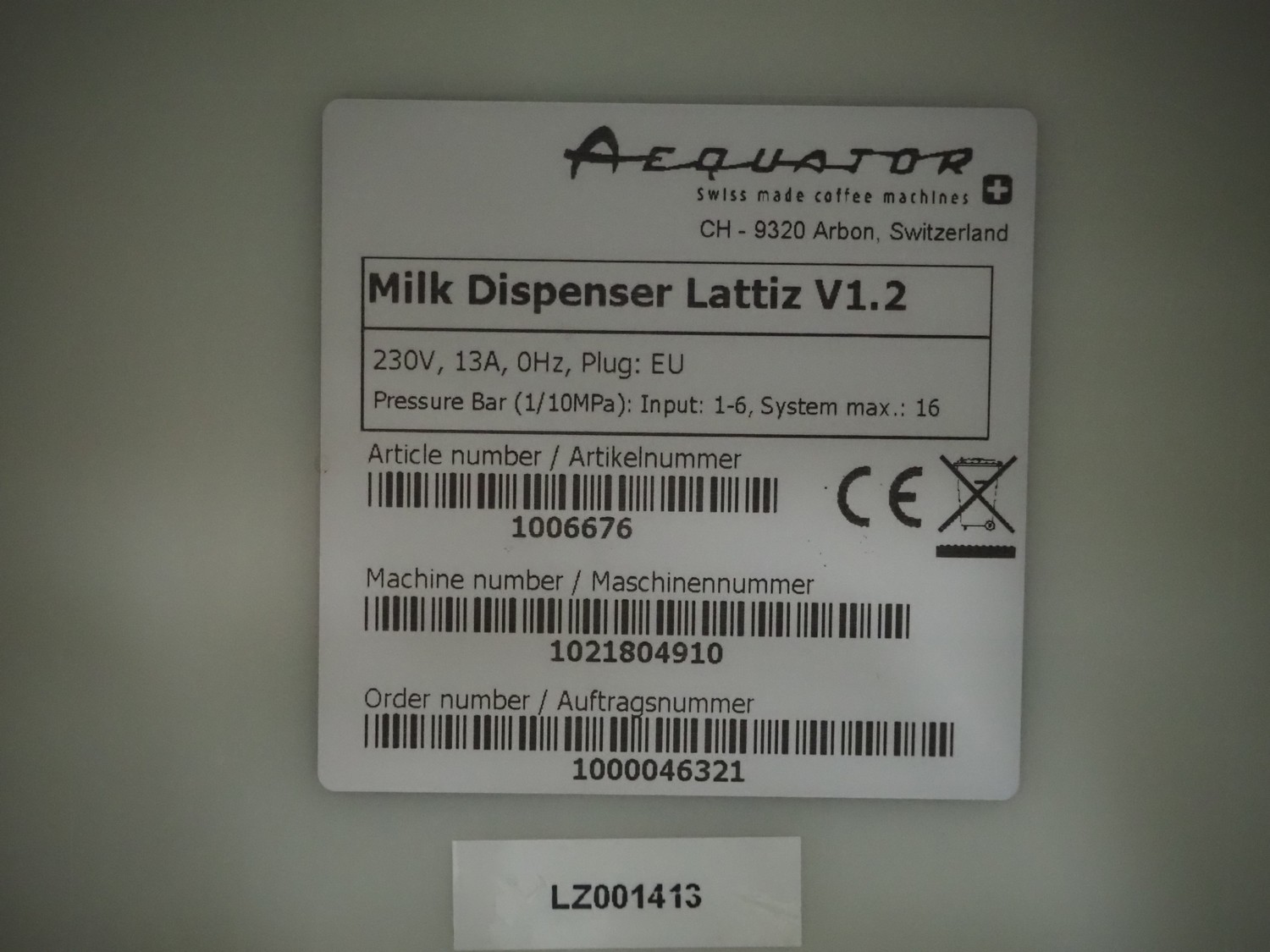 Aequator milk frother, model: Lattiz V1.2, machine number: 1021804910, 230 V, 13 A, dimensions: 510 mm x 200 mm x 590 mm.