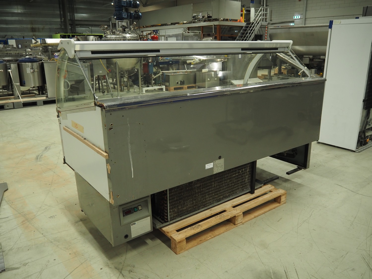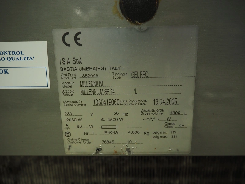 ISA S.p.A. refrigeration showcase, type: GEL PRO, model: MILLENNIUM, serial number: 1050419060, year of construction: 2005, 230 V, 50 Hz, 2650 W, volume: 1300 litres, holds 24 containers, refrigerant: R404A/4.000kg, dimensions: 2150 mm x 1050 mm x 1400 mm.