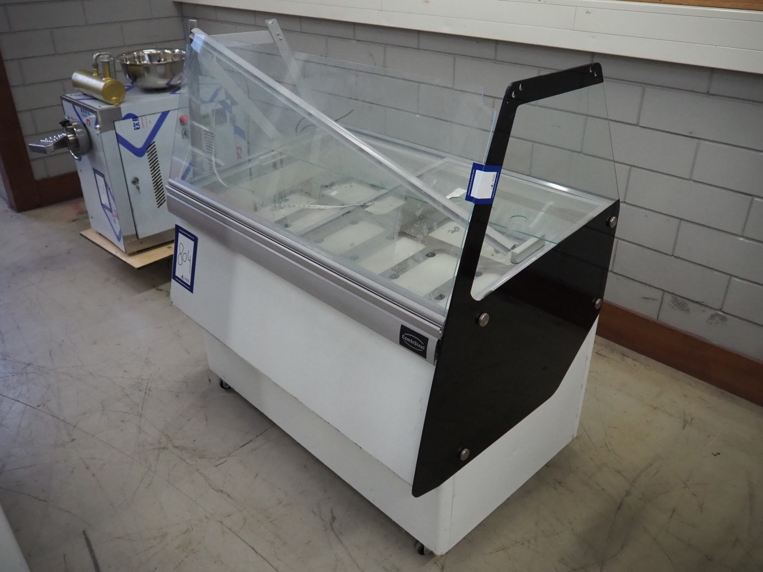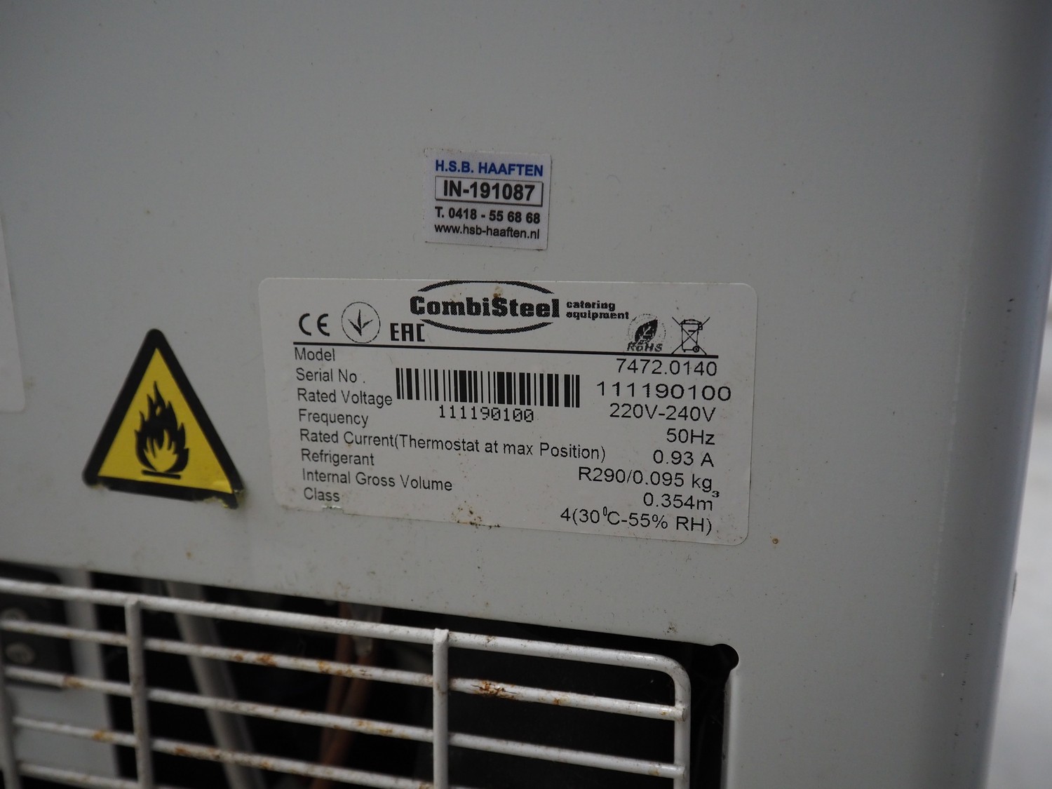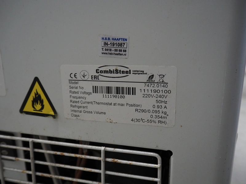 CombiSteel refrigerated showcase, model: 7472.0140, serial number: 111190100, 220/240 V, 50 Hz, 0.93 A, refrigerant: R290, 0.095 kg, 8 compartments, dimensions compartments: (8x) 335 mm x 140 mm, total dimensions: 1210 mm x 850 mm x 1280 mm.