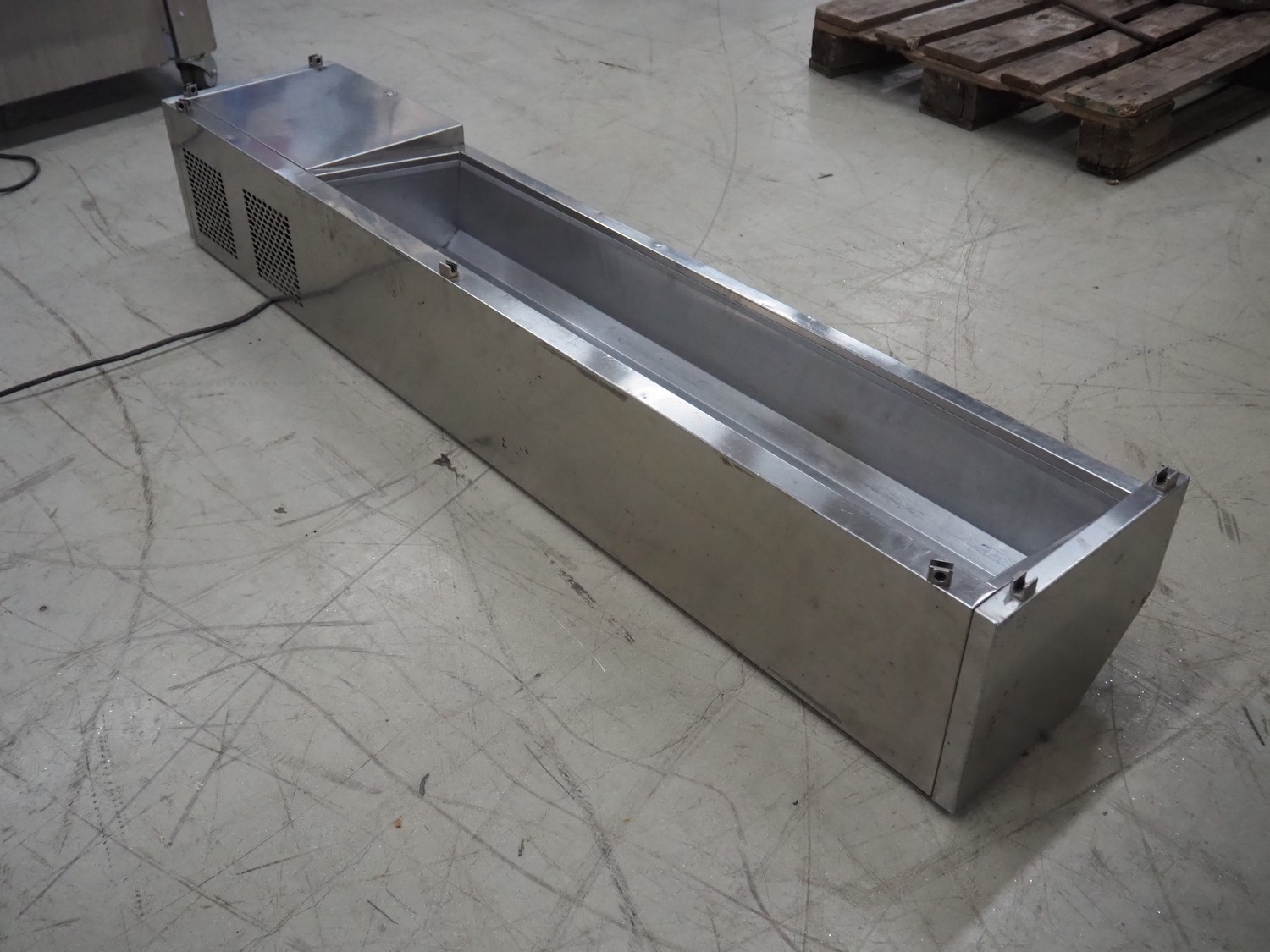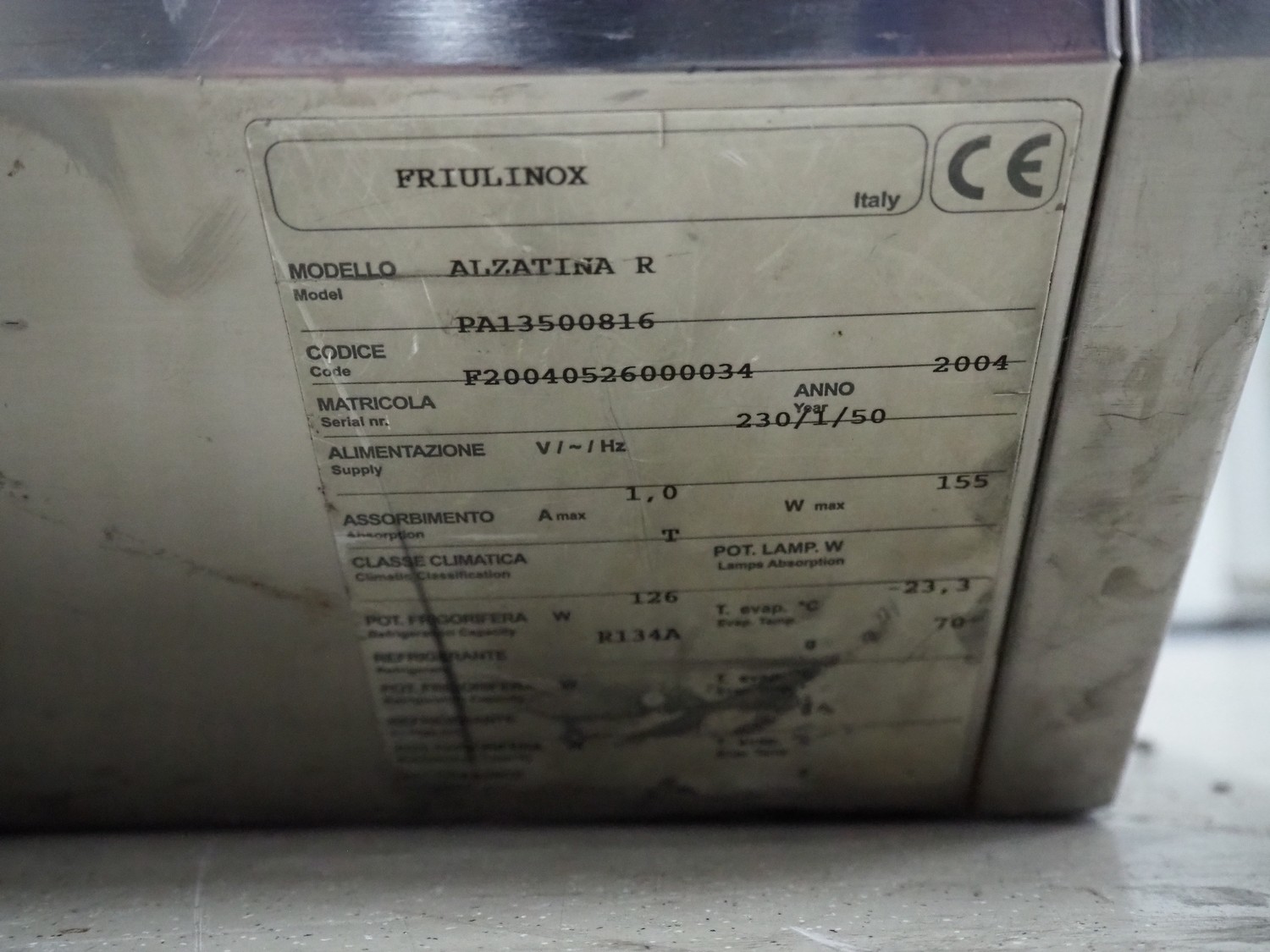 Friulinox saladette, model: Alzatina R, serial number: F200405260000034, year of construction: 2004, 230 V, 1 Ph, 50 Hz, 1.0 A, 155 W, refrigerant: R134a, 70 gram, dimensions: 1600 mm x 300 mm x 300 mm.