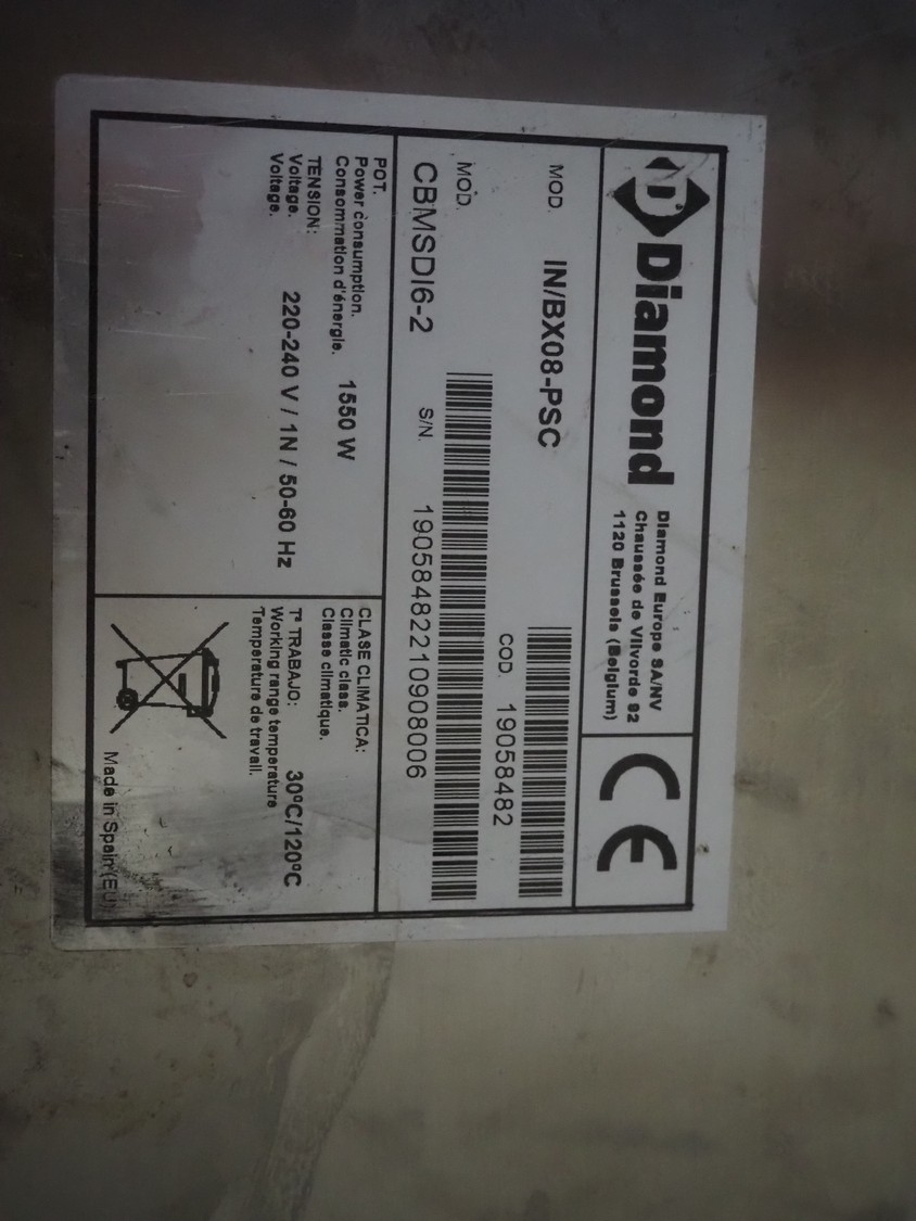 Diamond cooling tub, model: IN/BX08-PSC, serial number: 19058482210908006, 220/240 V, 1 Ph, 50/60 Hz, 1550 W, inside dimensions: 625 mm x 510 mm x 215 mm, total dimensions: 790 mm x 610 mm x 435 mm.
