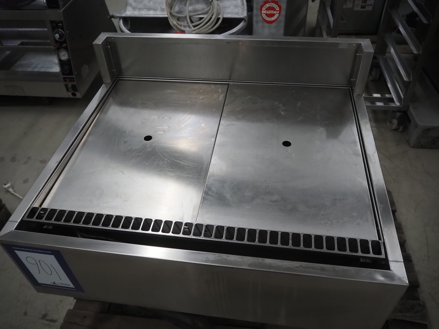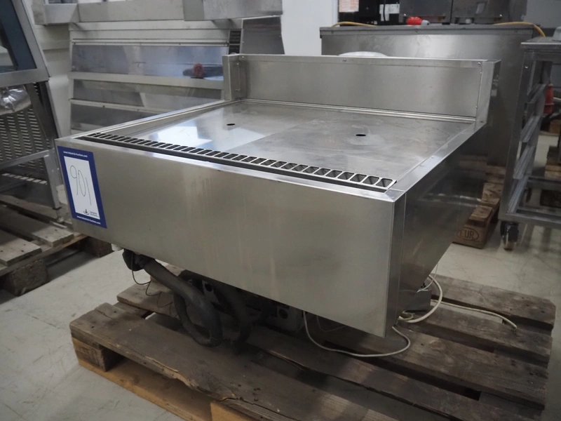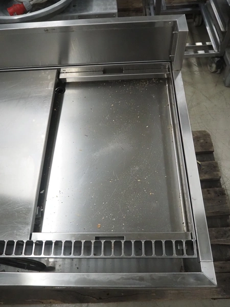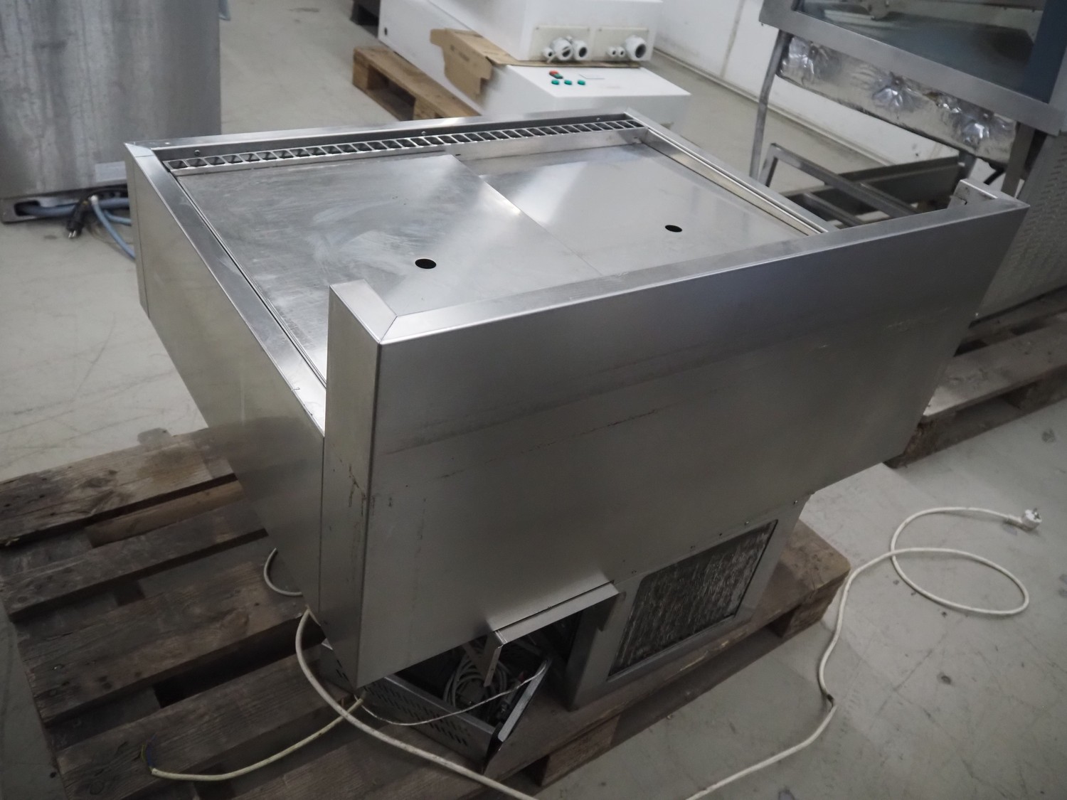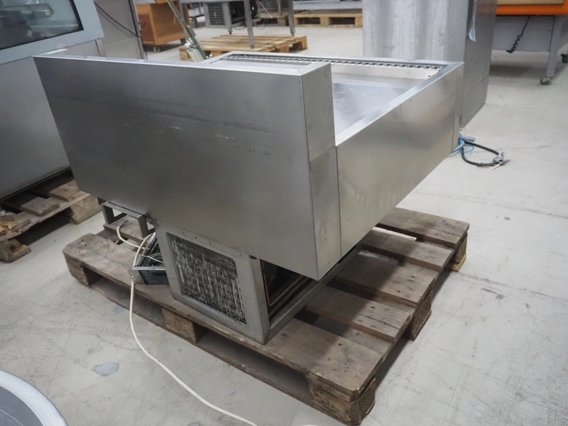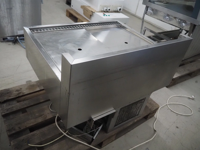 S/s refrigerated counter, dimensions: 880 mm x 750 mm x 690 mm. Incomplete, missing glass covers.