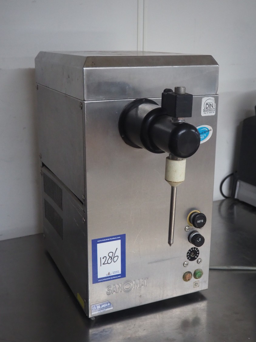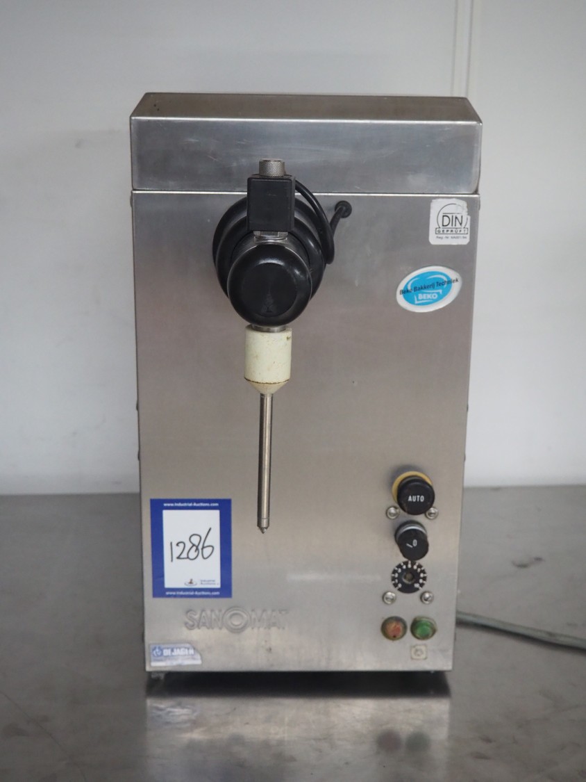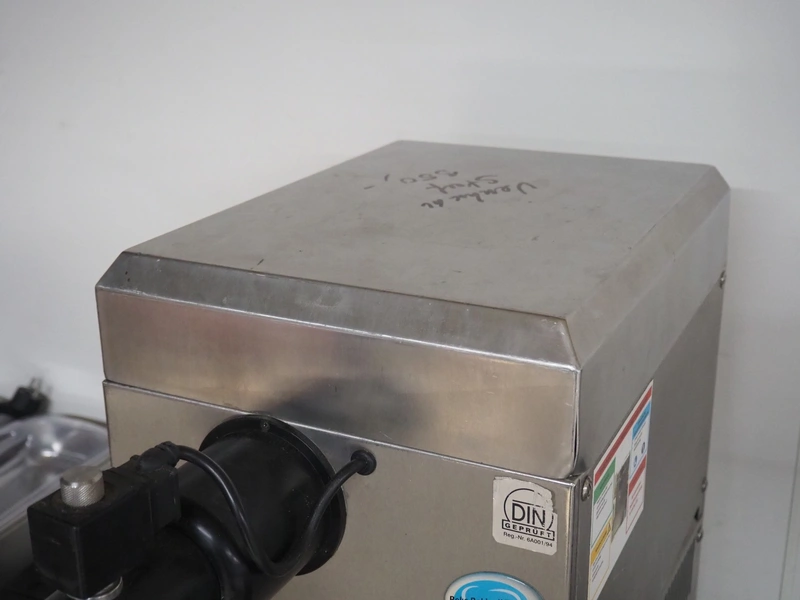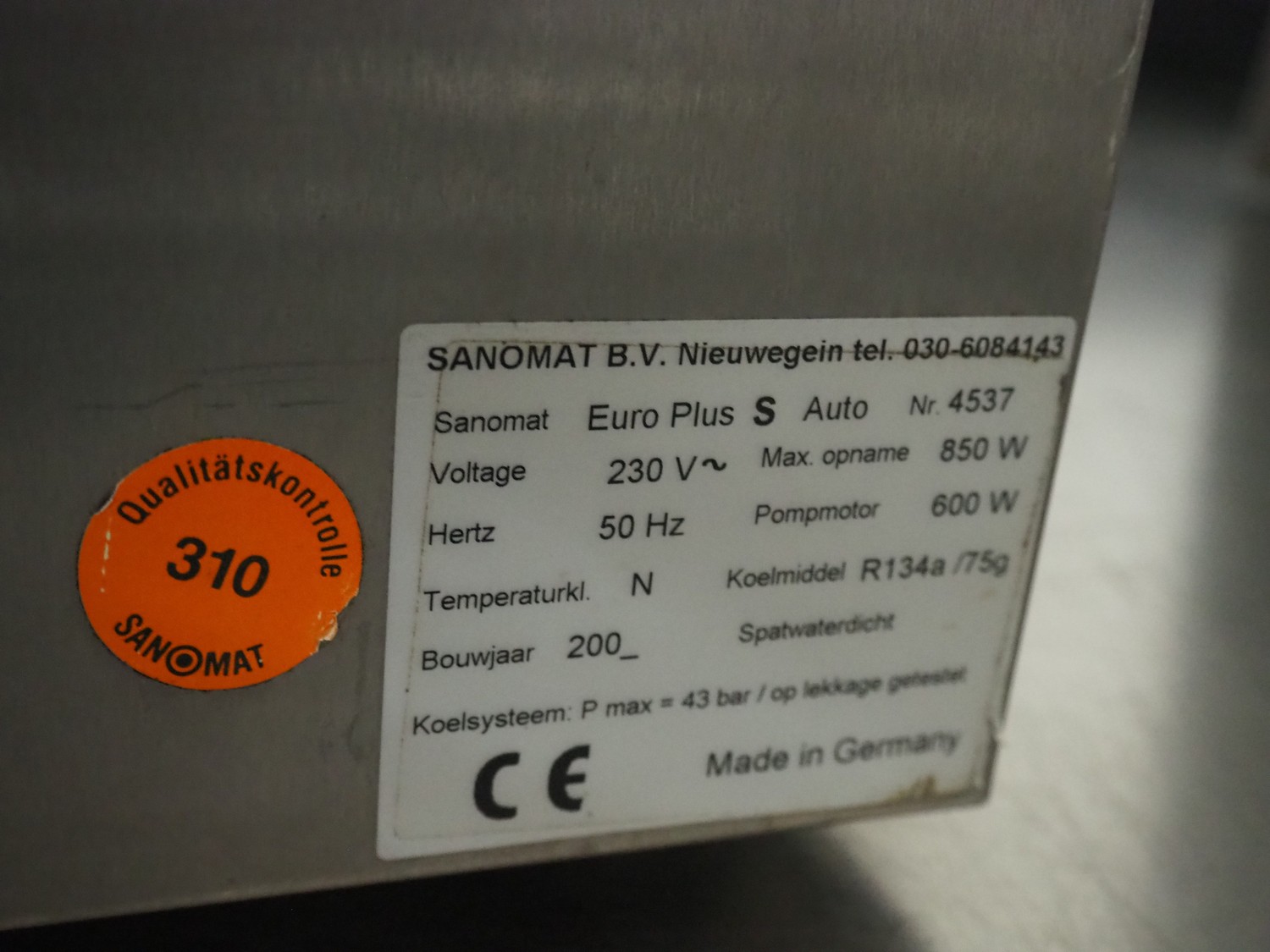 Sanomat B.V. whipped cream machine, type: Euro Plus S Auto, number: 4537, 230 V, 50 Hz, 850 W, refrigerant: R134a/75 g, dimensions: 580 mm x 300 mm x 560 mm.