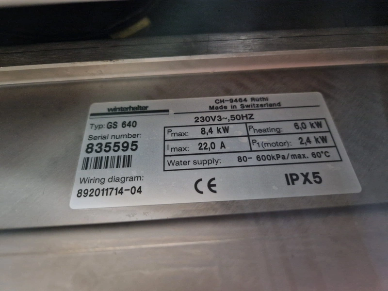 Winterhalter dishwasher, type: GS 640, serial number: 835595, 230 V, 3 Ph, 50 Hz, 22.0 A, 8.4 kW, crate dimensions: 700 mm x 600 mm x 150 mm, total dimensions: 850 mm x 750 mm x 1650 mm.