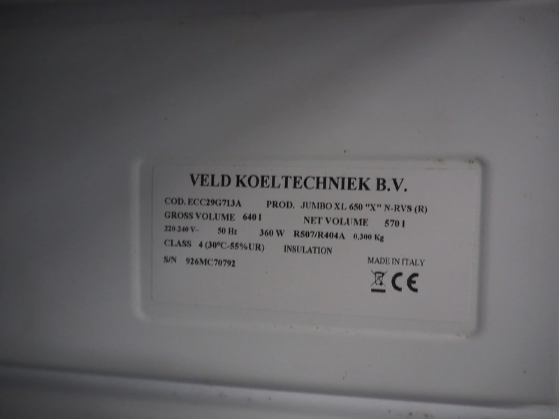 Veld Koeltechniek B.V. freezer, model: JUMBO XL 650 "X" N-RVS (R), serial number: 926MC70792, 220-240 V, 50 Hz, 360 W, gross volume: 640 litres, netto volume: 570 litres, refrigerant: R507/R404A - 0.300 kg, 20 floors, dimensions floors: (20x) 500 mm x 630 mm, total dimensions: 800 mm x 800 mm x 1880 mm.