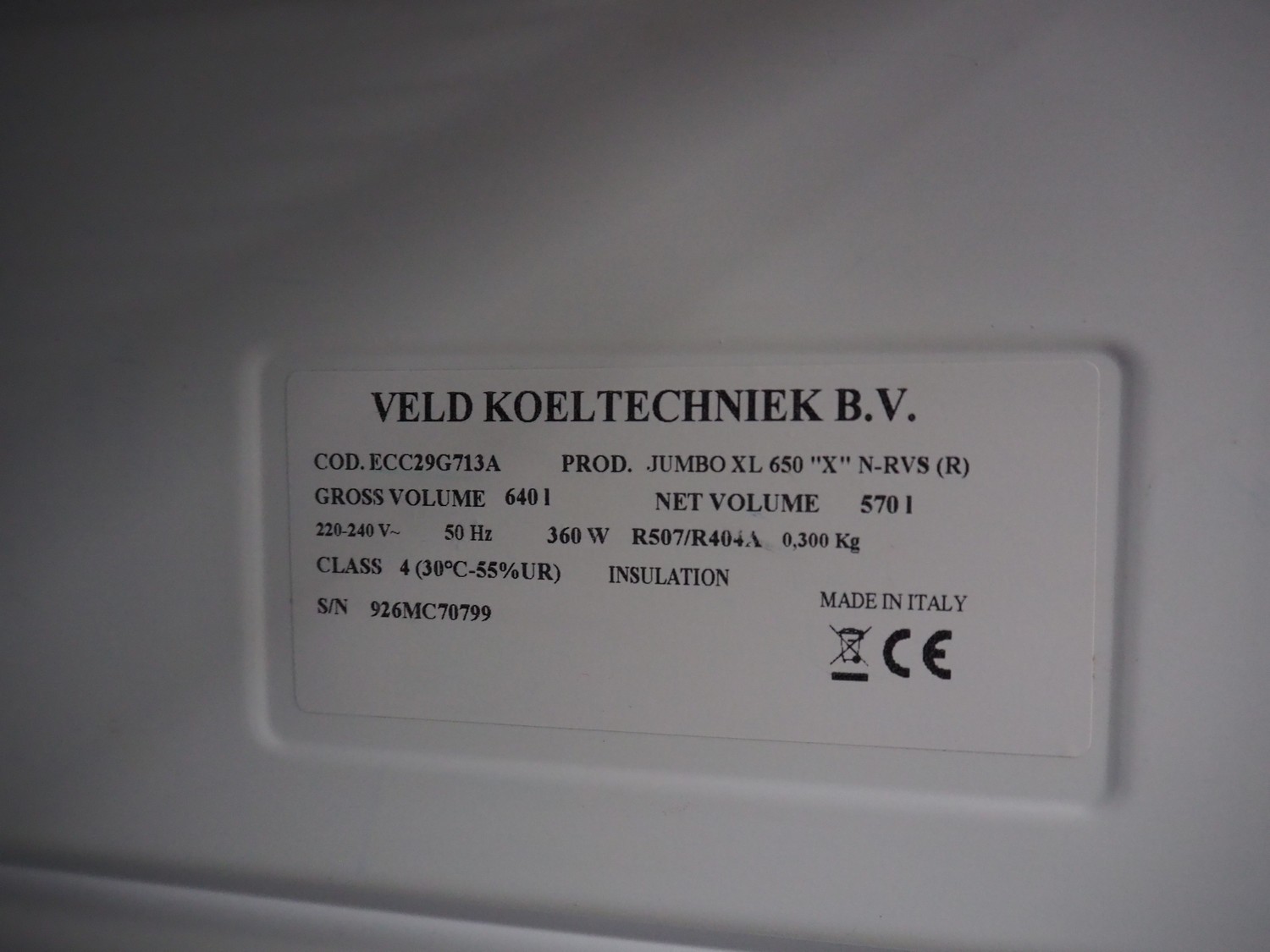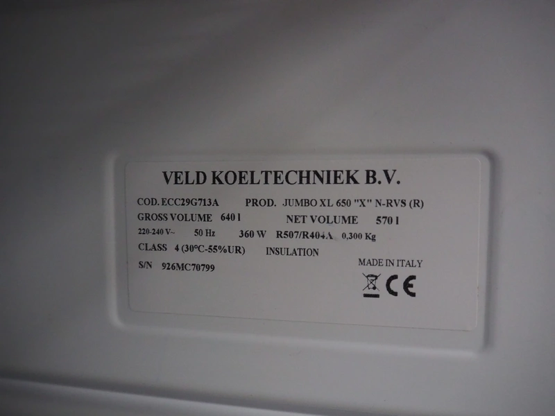 Veld Koeltechniek B.V. freezer, model: JUMBO XL 650 "X" N-RVS (R), serial number: 926MC70799, 220-240 V, 50 Hz, 360 W, gross volume: 640 litres, netto volume: 570 litres, refrigerant: R507/R404A - 0.300 kg, 20 floors, dimensions floors: (20x) 500 mm x 630 mm, total dimensions: 800 mm x 800 mm x 1880 mm.