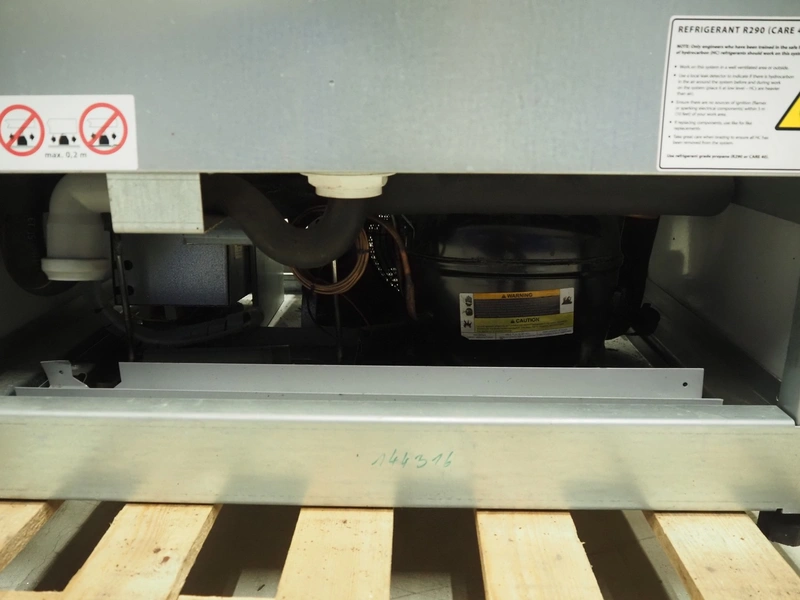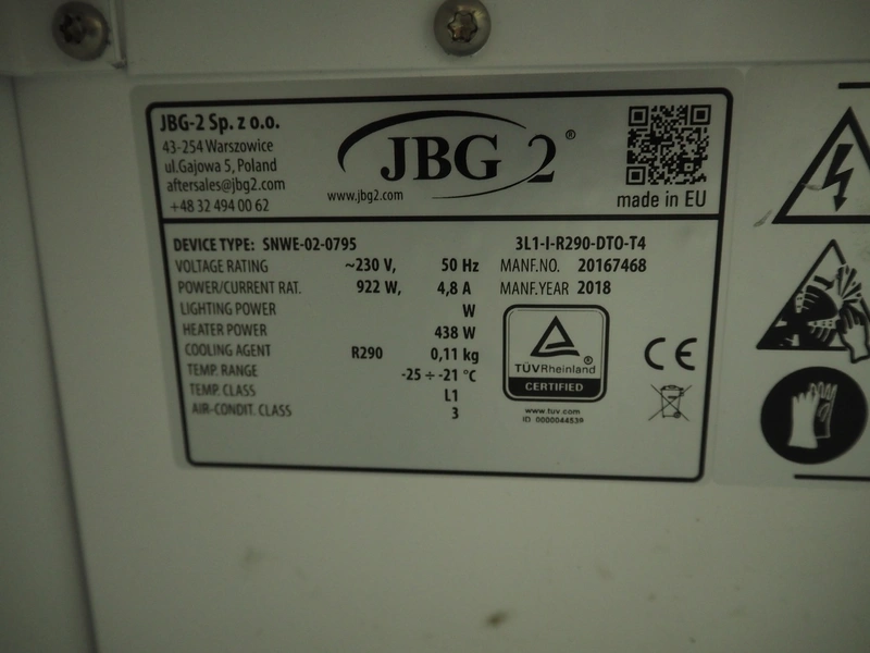 JBG freezer, type: SNWE-02-0795, machine number: 20167468, year of construction: 2018, 230 V, 50 Hz, 922 W, 4.8 A, refrigerant: R290/0.11kg, dimensions: 900 mm x 700 mm x 2000 mm. Cooling compressor broken.
