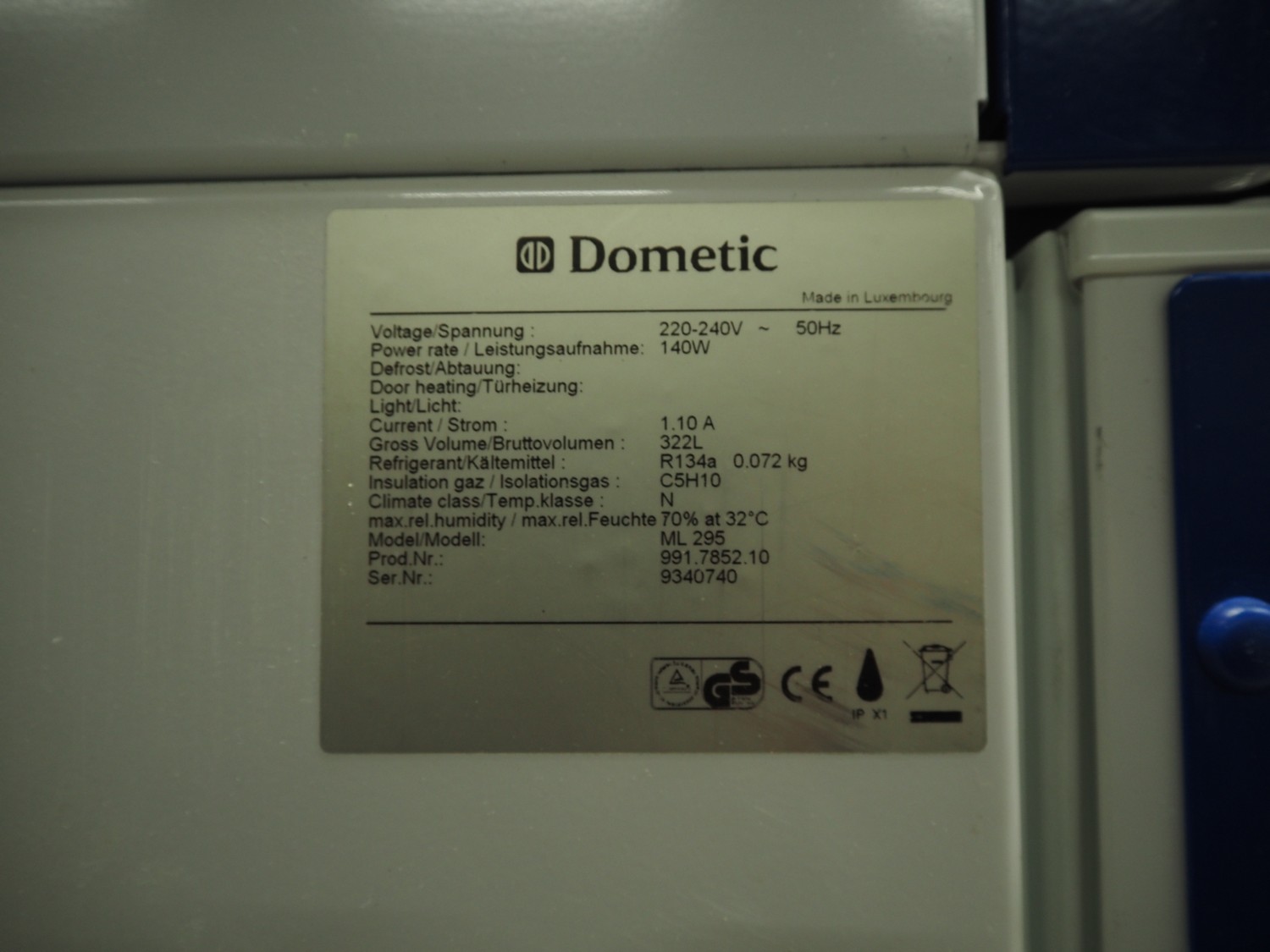Dometic freezer, type: ML 295, serial number: 9340740, 220-240 V, 50 Hz, 140 W, volume: 322 litres, refrigerant: R134a/0.072g, dimensions: 600 mm x 600 mm x 800 mm.