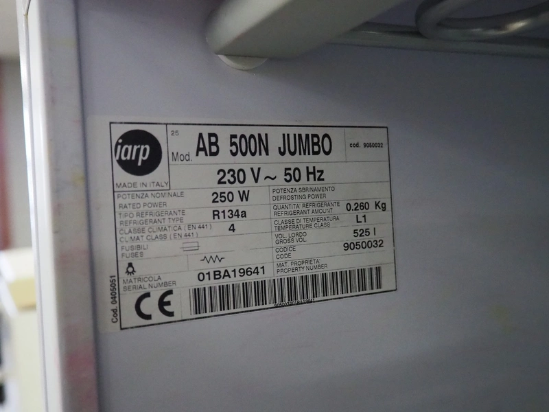 Iarp freezer, model: AB 500N JUMBO, serial number: 01BA19641, 230 V, 50 Hz, 1.9 A, 250 W, volume: 525 liter, refrigerant: R134a / 0.260 kg, dimensions: 780 mm x 730 mm x 1710 mm.