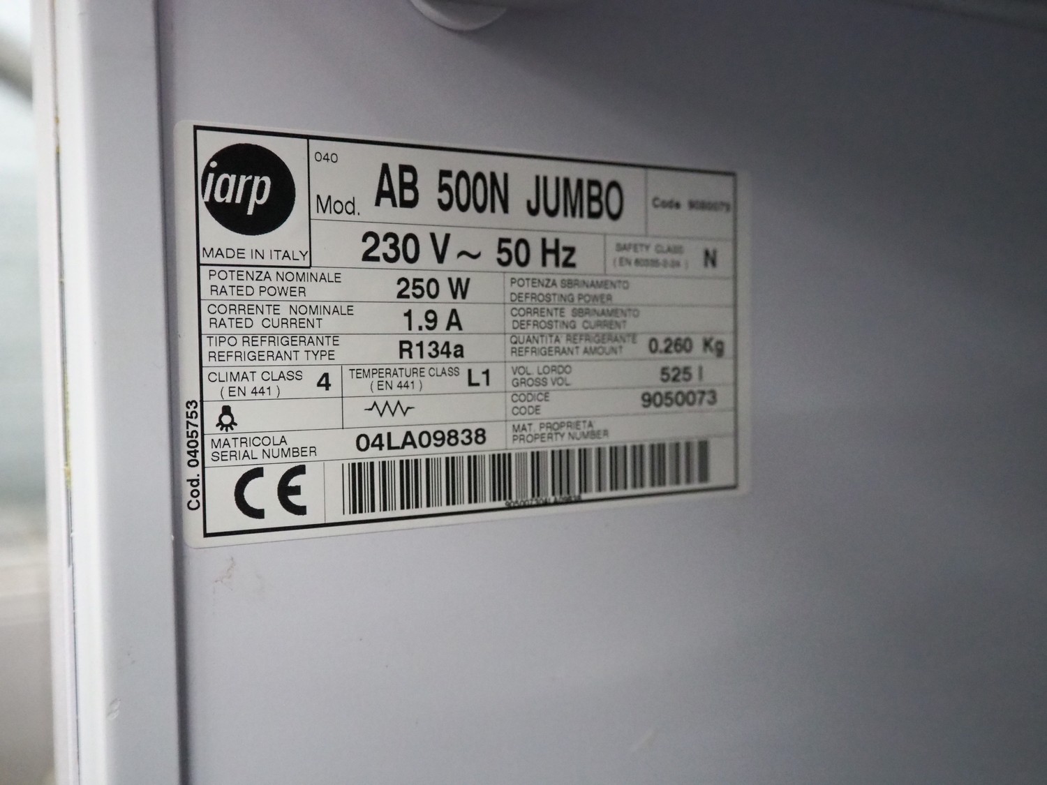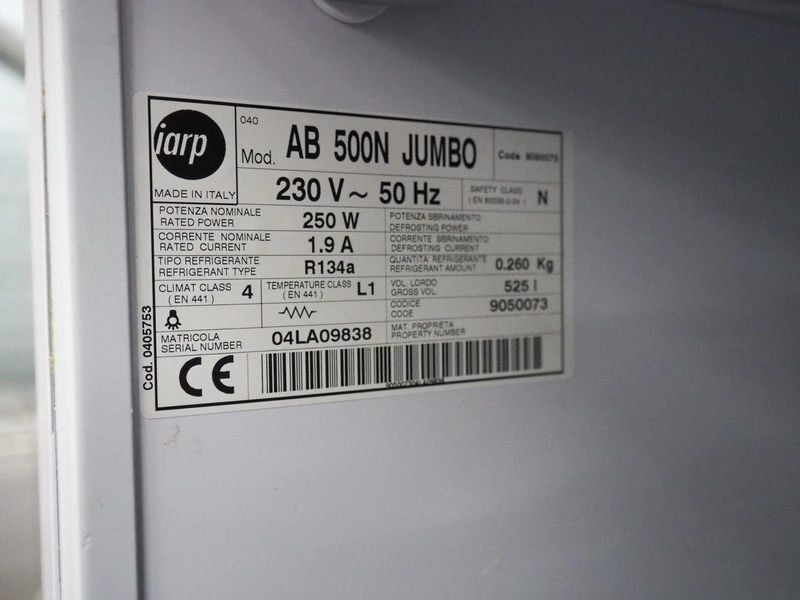 Iarp freezer, model: AB 500N JUMBO, serial number: 04LA09838, 230 V, 50 Hz, 1.9 A, 250 W, volume: 525 liter, refrigerant: R134a / 0.260 kg, dimensions: 780 mm x 730 mm x 1710 mm.