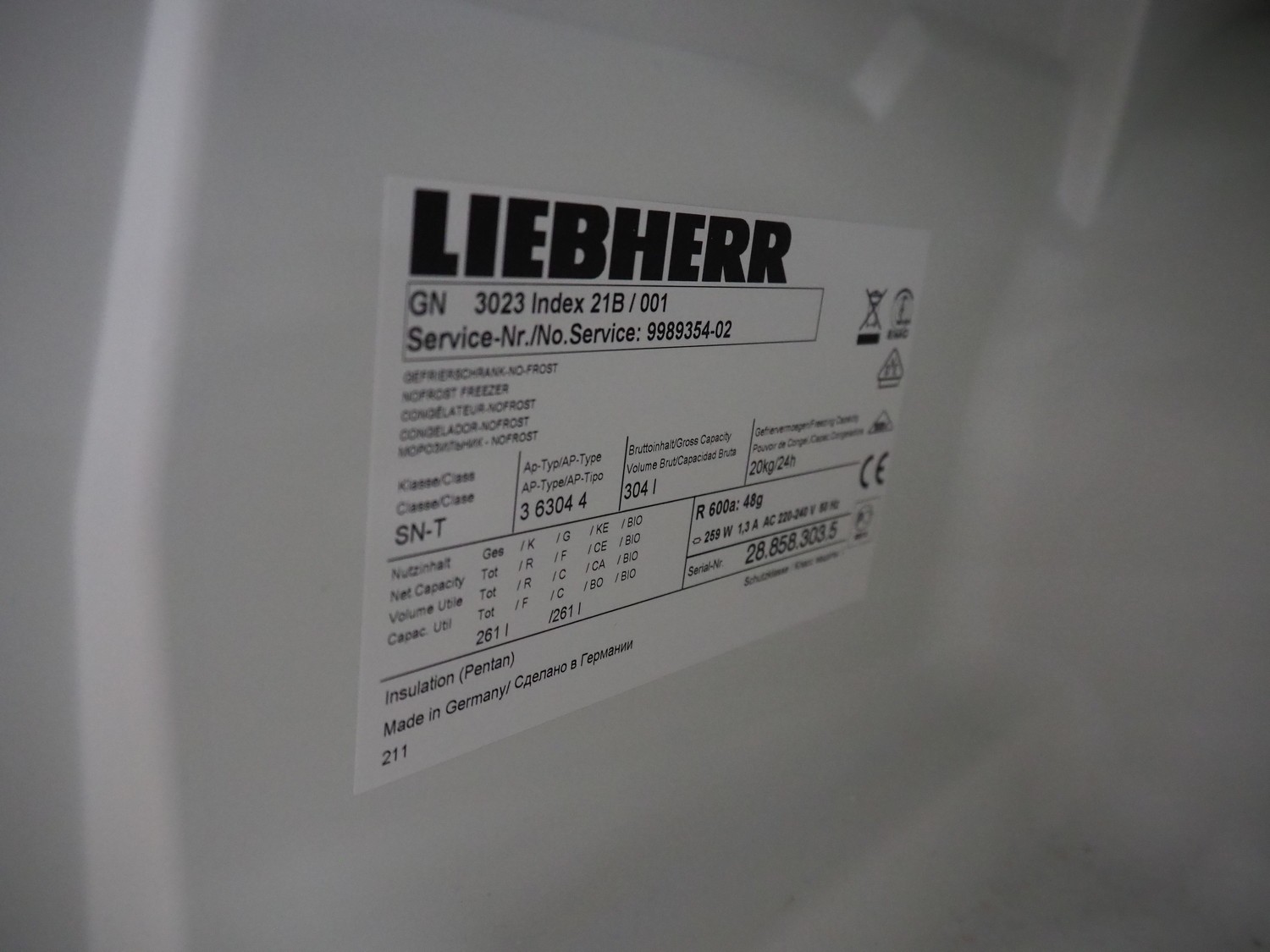 Liebherr freezer, dimensions: 660 mm x 600 mm x 1850 mm.