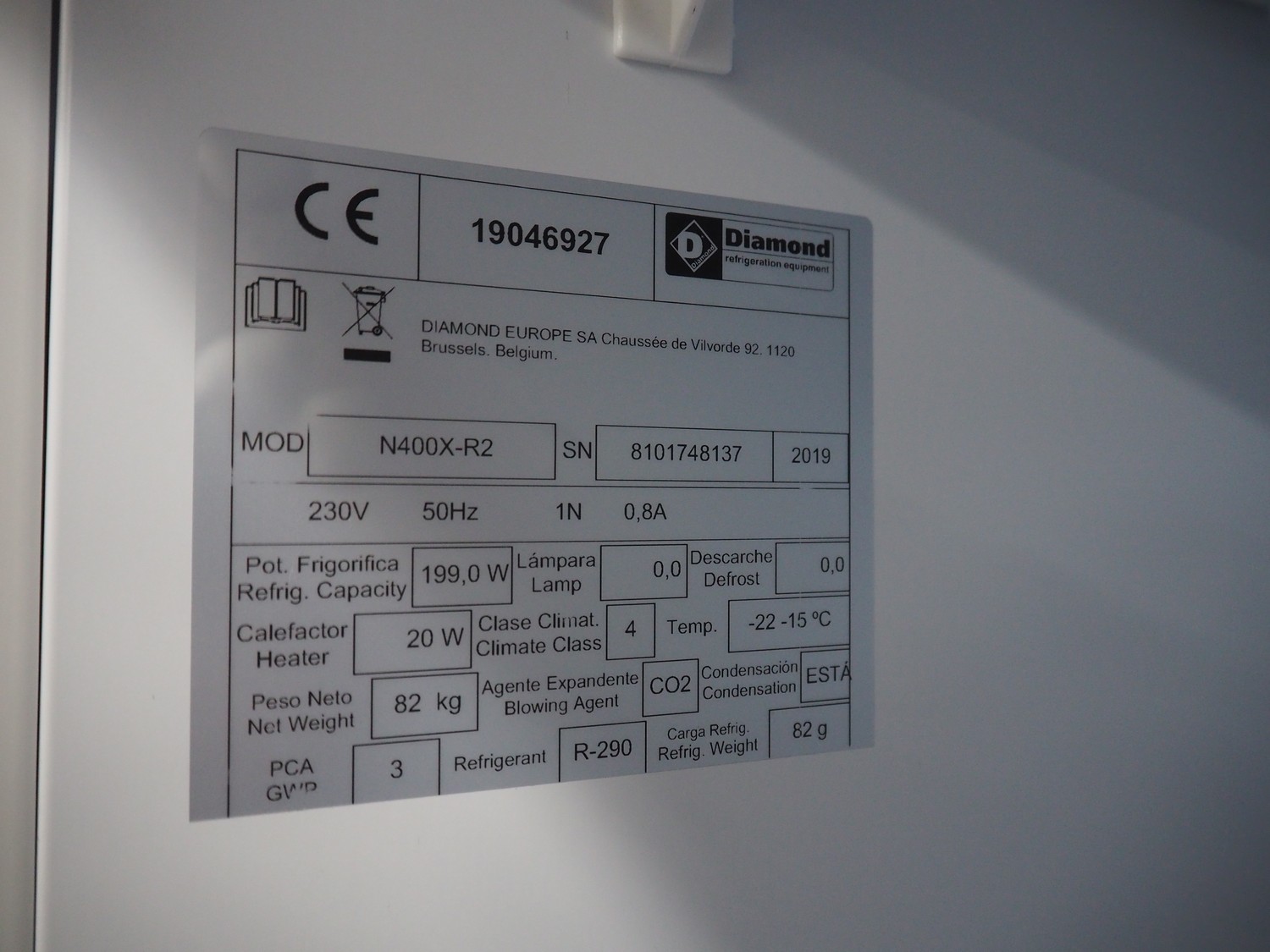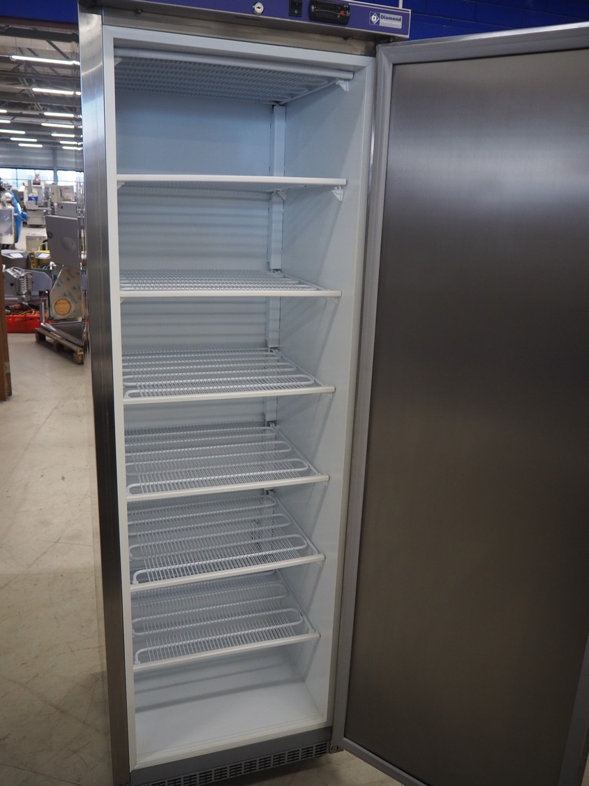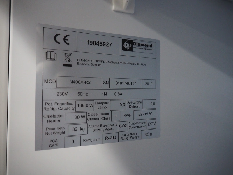 Diamond freezer, model: N400X-R2, serial number: 8101748137, year of construction: 2019, 230 V, 50 Hz, 1 Ph, 0.8 A, refrigerant: R-290,/82 g, 5 floors, dimensions floors: (5x) 490 mm x 500 mm, total dimensions: 690 mm x 620 mm x 1920 mm.