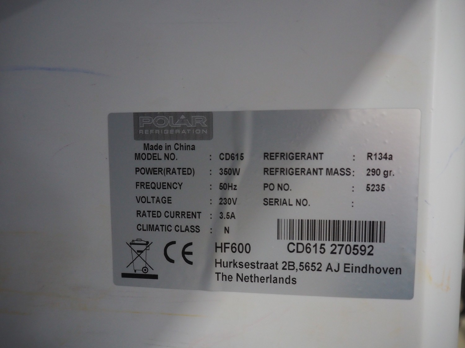 Polar freezer, model: CD615, 230 V, 50 Hz, 3.5 A, 350 W, refrigerant: R134a/290 g, 6 floors, dimensions floors: (6x) 525 mm x 655 mm, total dimensions: 70 mm x 770 mm x 1900 mm.