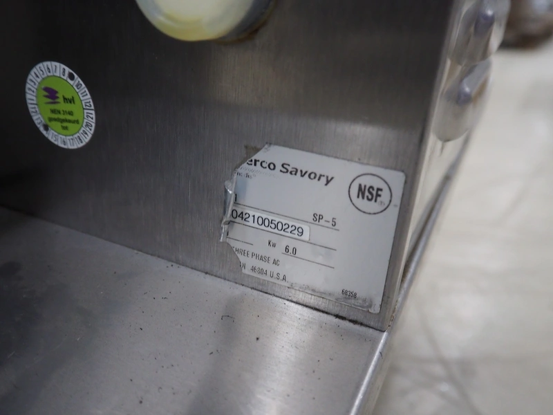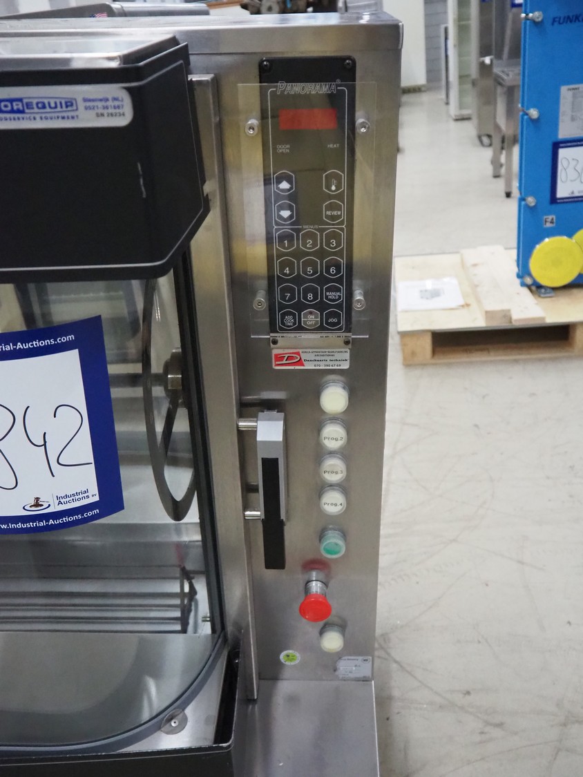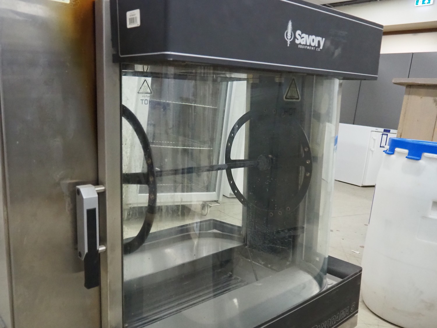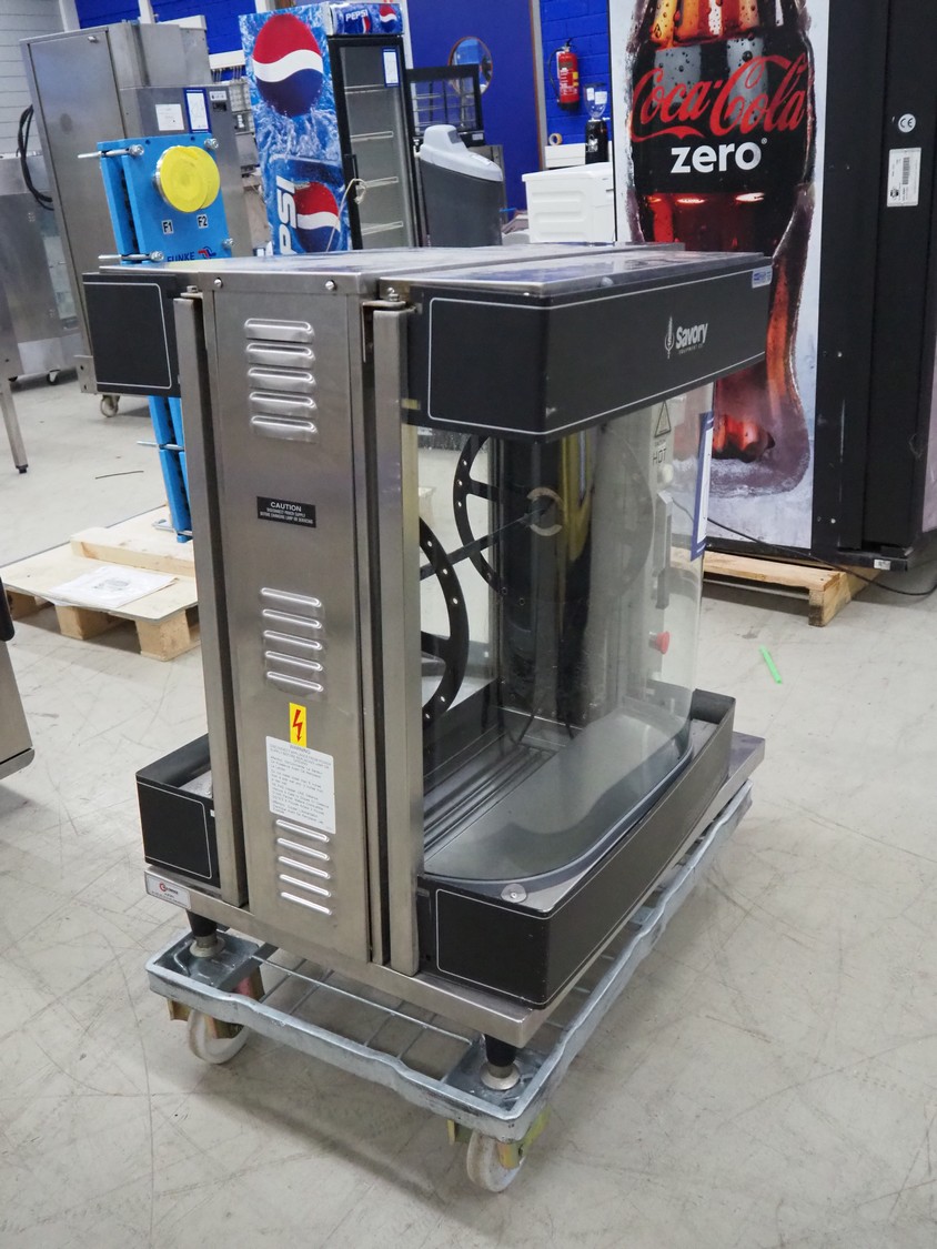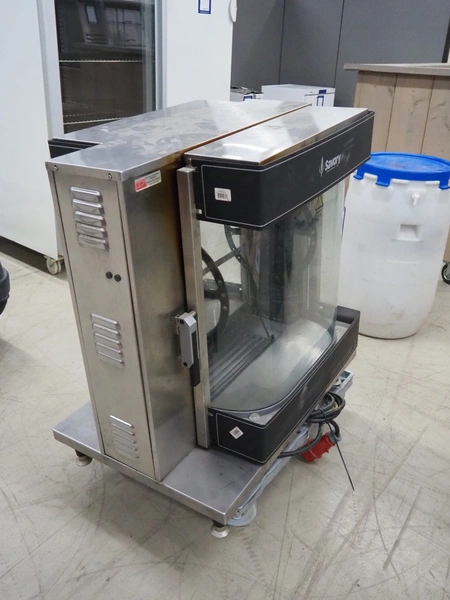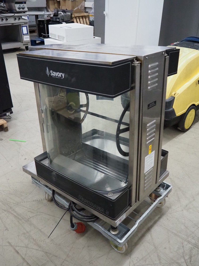 Merco Savory rotisserie grill on s/s trolley, model: SP-5, type: Panorama 5, 6 kW, 1 grill basket, dimensions basket: 450 mm x 160 mm, total dimensions: 860 mm x 625 mm x 1100 mm.