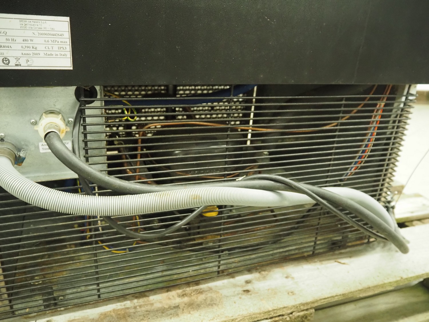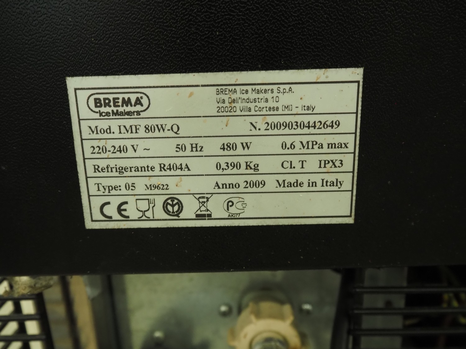 BREMA Ice Makers S.p.A. ice machine, model: IMF 80W-Q, number: 2009030442649, year of construction: 2009, 220-240 V, 50 Hz, 480 W, refrigerant: R404a / 0.390 kg, dimensions: 740 mm x 600 mm x 920 mm.