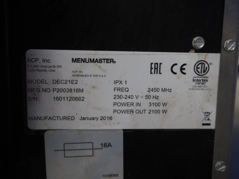 ACP, Inc. microwave, model: DEC21E2, serial number: 1601120602, year of construction: 1/2016, 230/240 V, 1 Ph, 50 Hz, 16 A, 3100 W, inside dimensions: 300 mm x 330 mm x 170 mm, total dimensions: 580 mm x 430 mm x 350 mm.