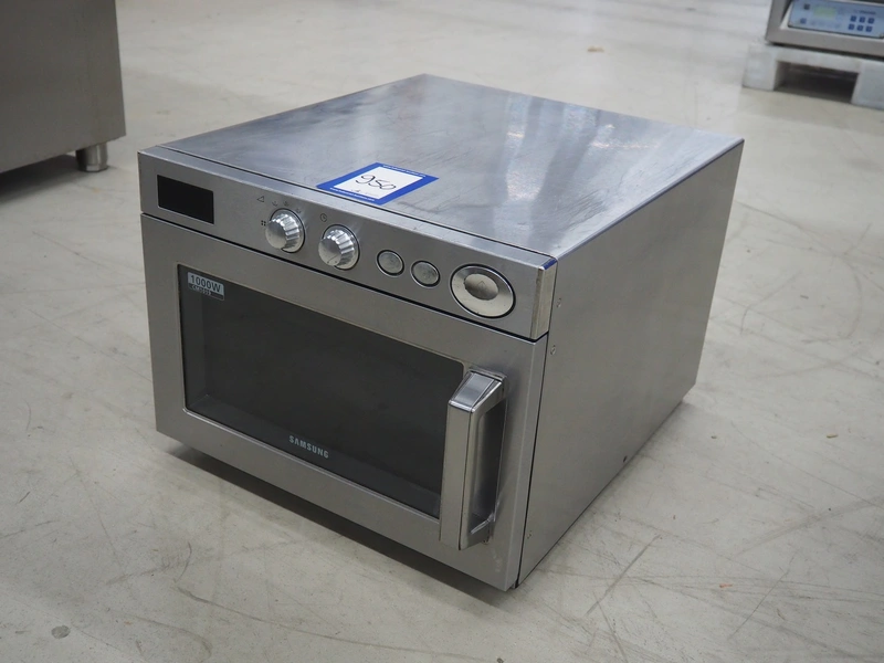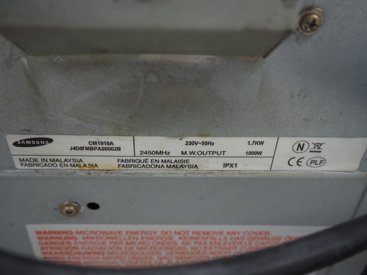 Samsung microwave, type: CM1019A, 230 V, 50 Hz, 1.7 kW, 2450 MHz, inside dimensions: 350 mm x 370 mm, total dimensions: 630 mm x 470 mm x 370 mm.