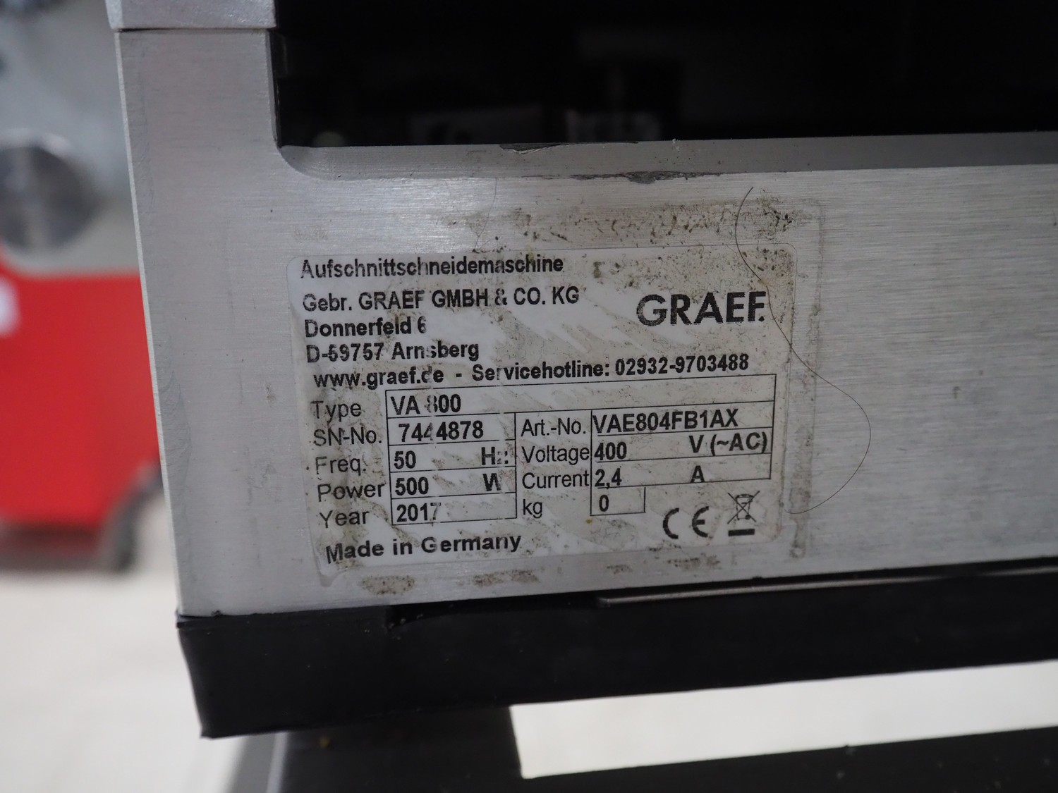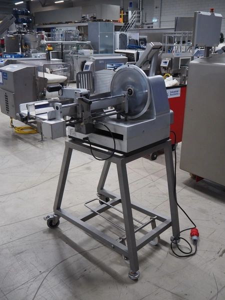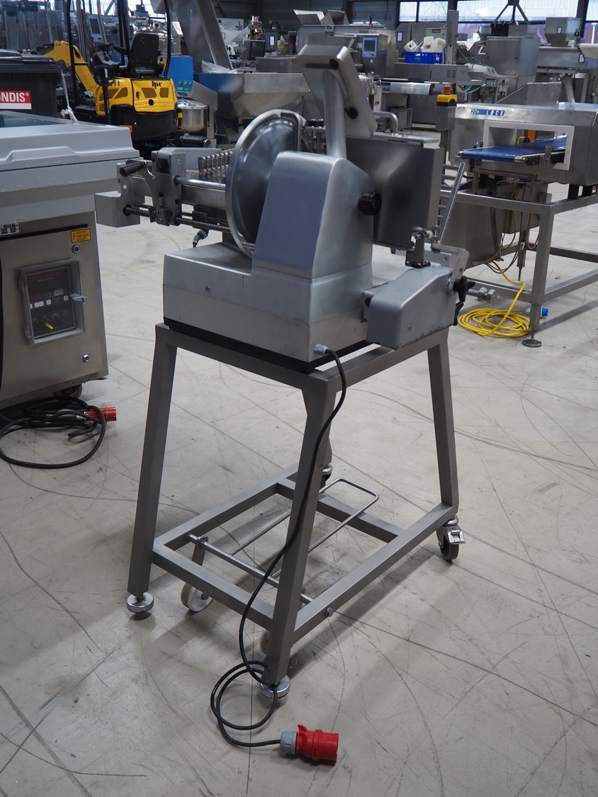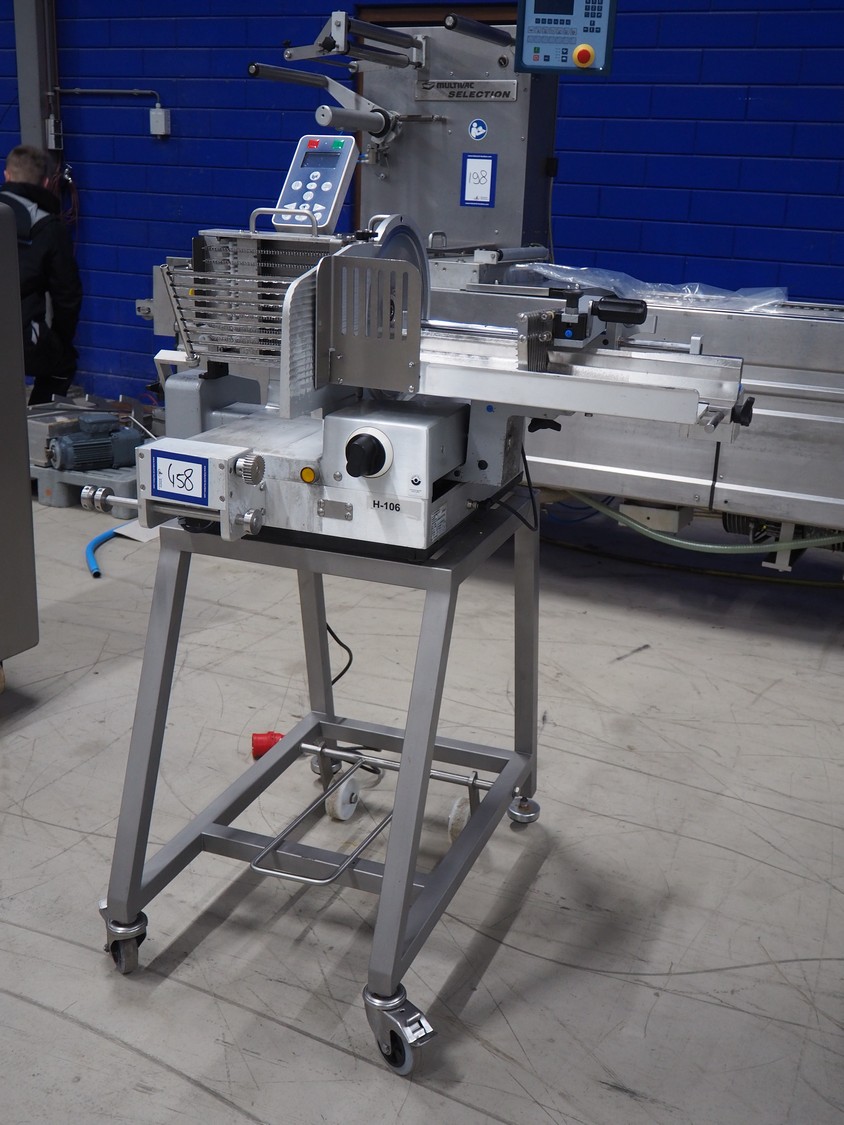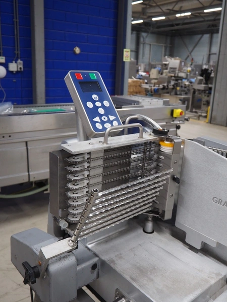 Graef automatic slicer on s/s mobile frame, type: VA800, serial number: 7444878 year of construction: 2017, 400 V, 50 Hz, 2.4 A, 500 watt, dimensions: 800 mm x 1000 mm x 1500 mm. Missing outfeed belt.
