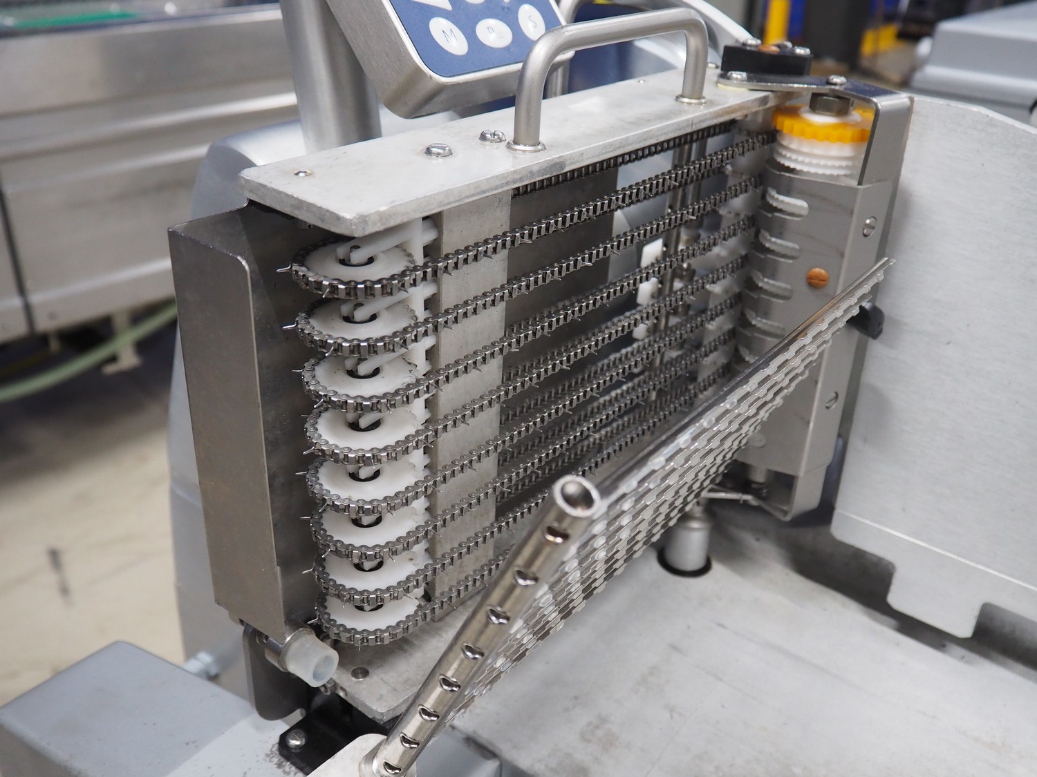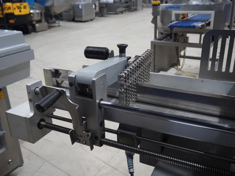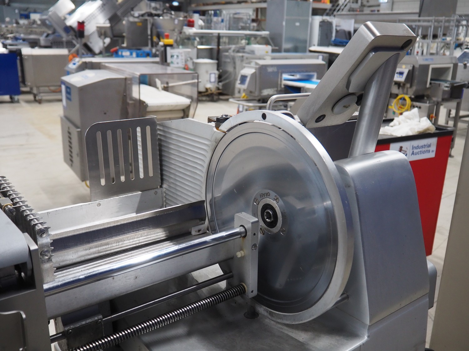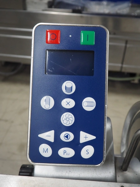 Graef automatic slicer on s/s mobile frame, type: VA800, serial number: 7444878 year of construction: 2017, 400 V, 50 Hz, 2.4 A, 500 watt, dimensions: 800 mm x 1000 mm x 1500 mm. Missing outfeed belt.