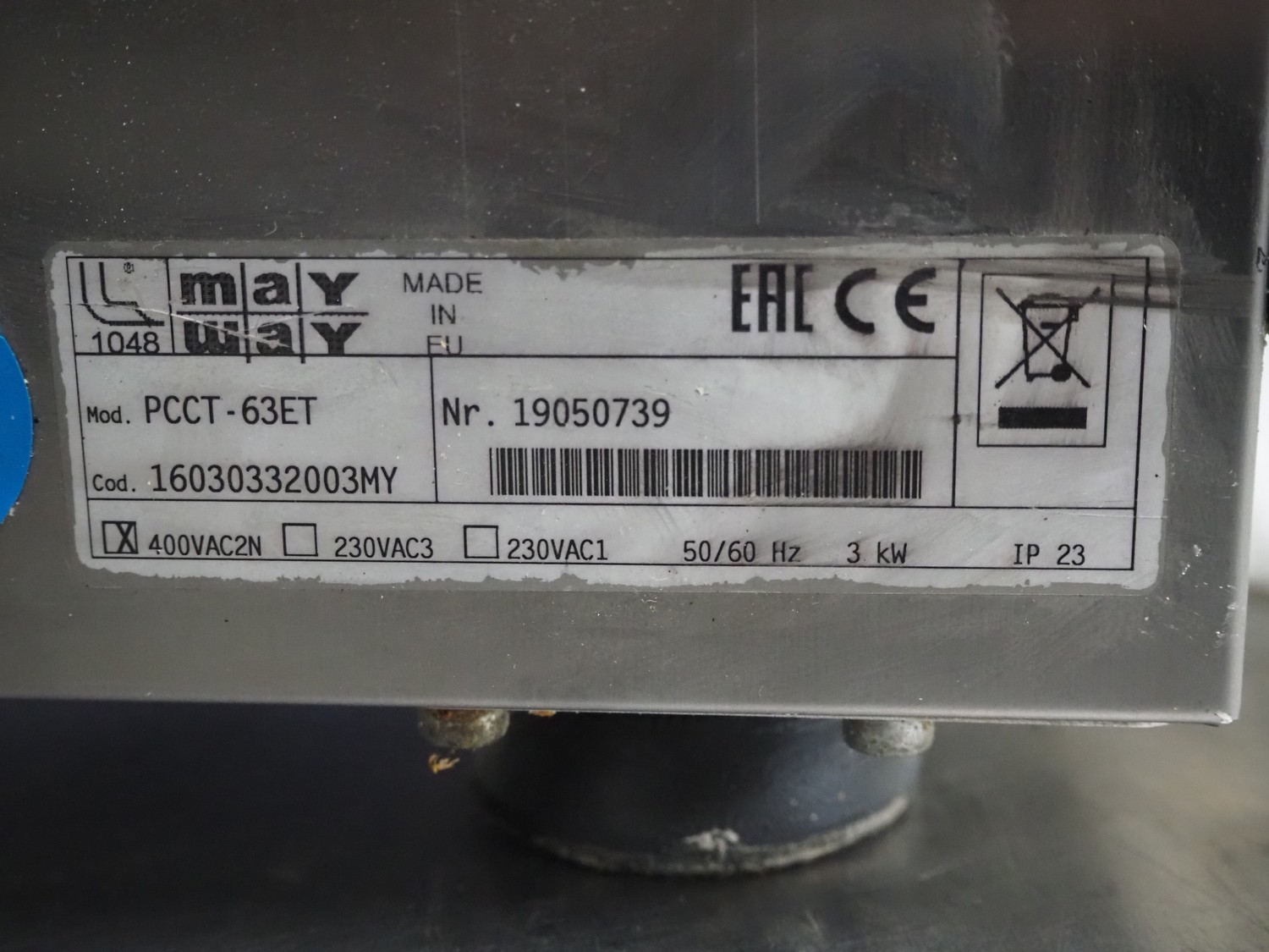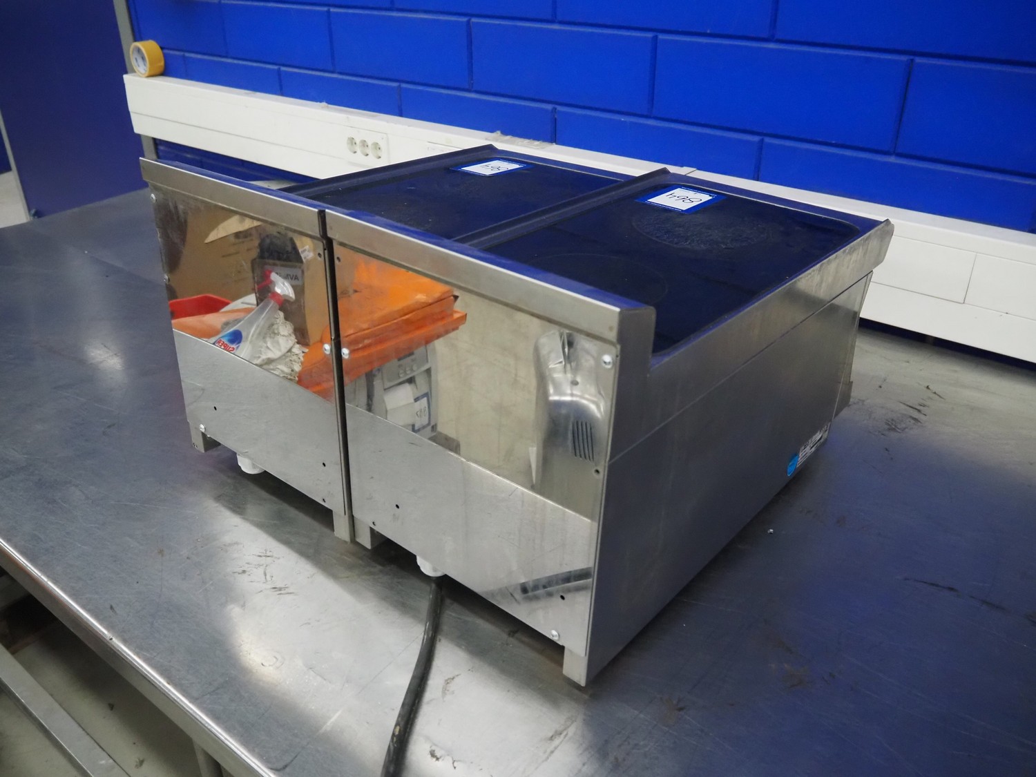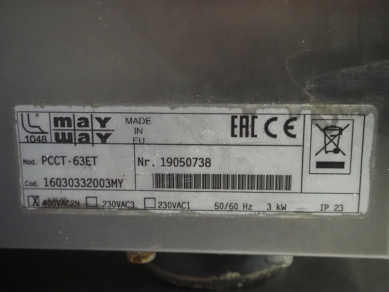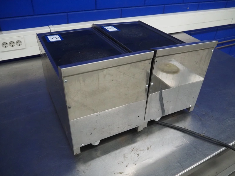 2 May 2-pits induction stoves, model: PCCT-63ET, number: 19050739, 400 V, 2 Ph, 50/60 Hz, 3 kW, dimensions: (2x) 610 mm x 300 mm x 380 mm.