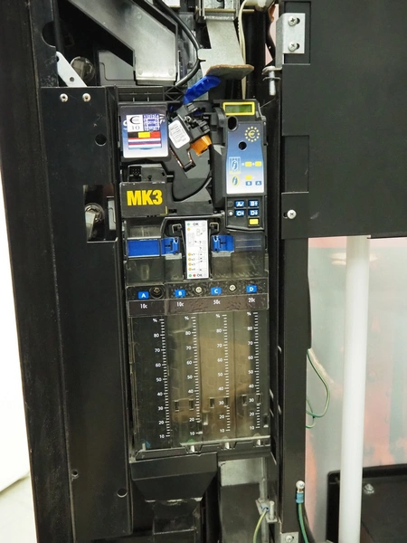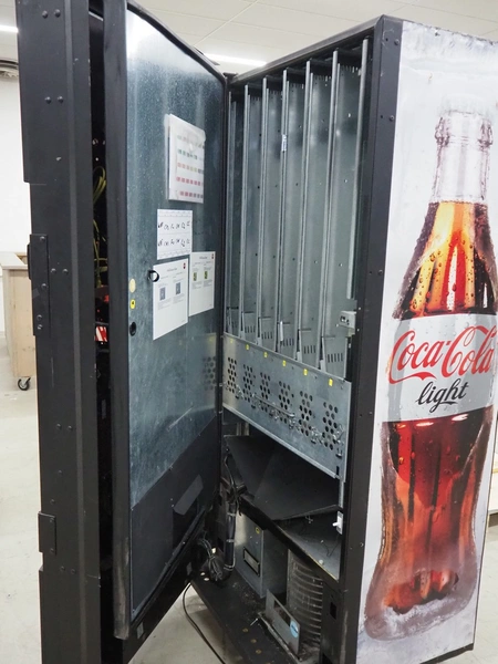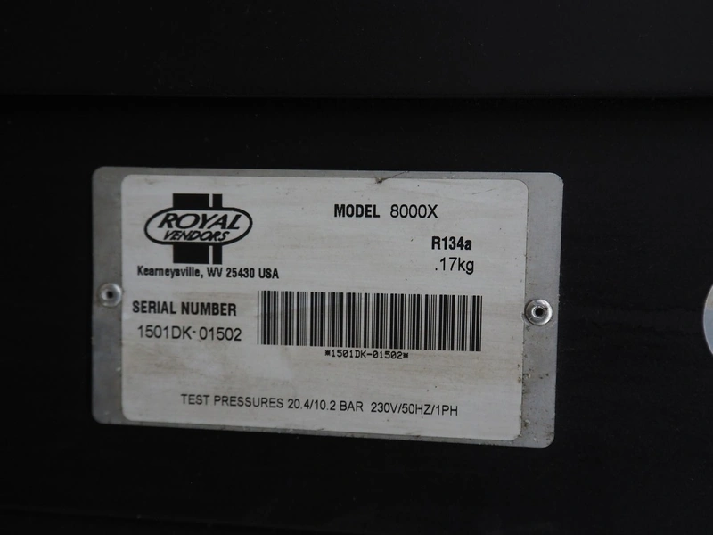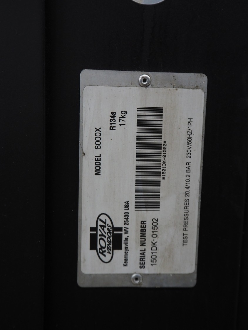Royal Vendors vending machine, model: 8000X, serial number: 1501DK-01502, 230 V, 1 Ph, 50 Hz, refrigerant: R134a, 0.17 kg, dimensions: 950 mm x 880 mm x 2130 mm.