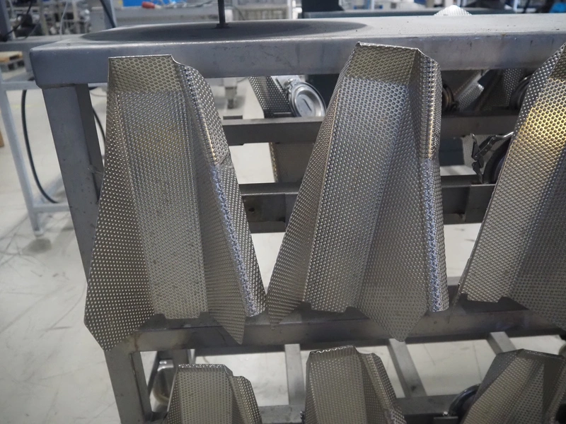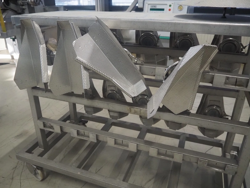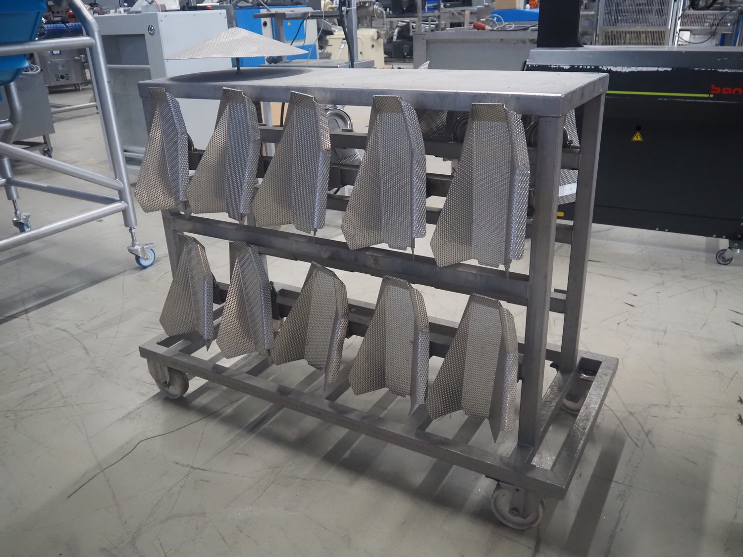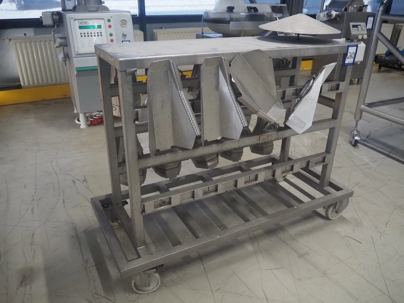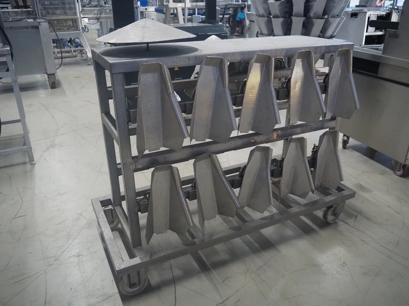 S/s trolley with parts for multihead weigher, dimensions: 1350 mm x 600 mm x 1100 mm.