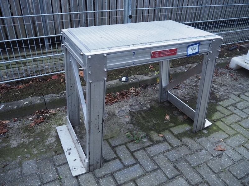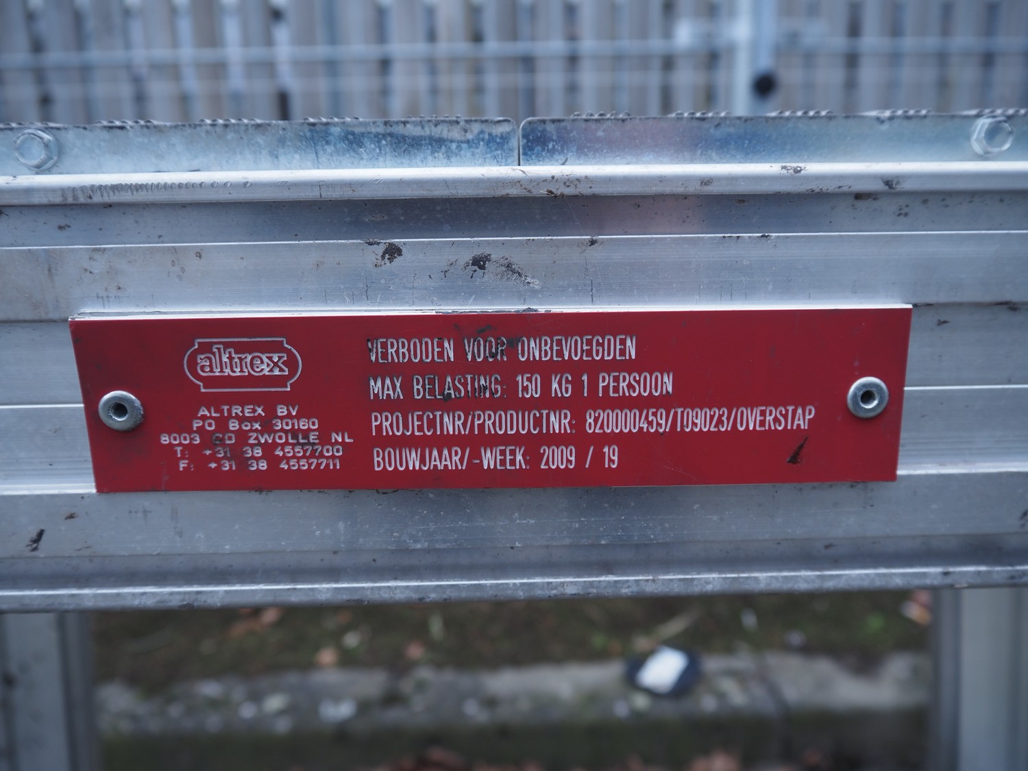 Altrex working platform, product number: 820000459/T09023/OVERSTAP, year of construction: 04/2009, max capacity: 150 kg, working height: 820 mm, total dimensions: 1230 mm x 540 mm x 820 mm.