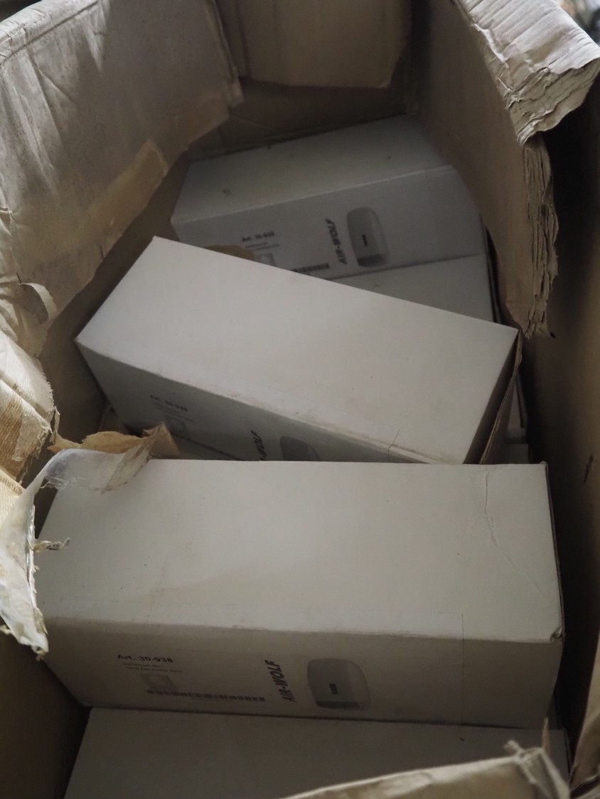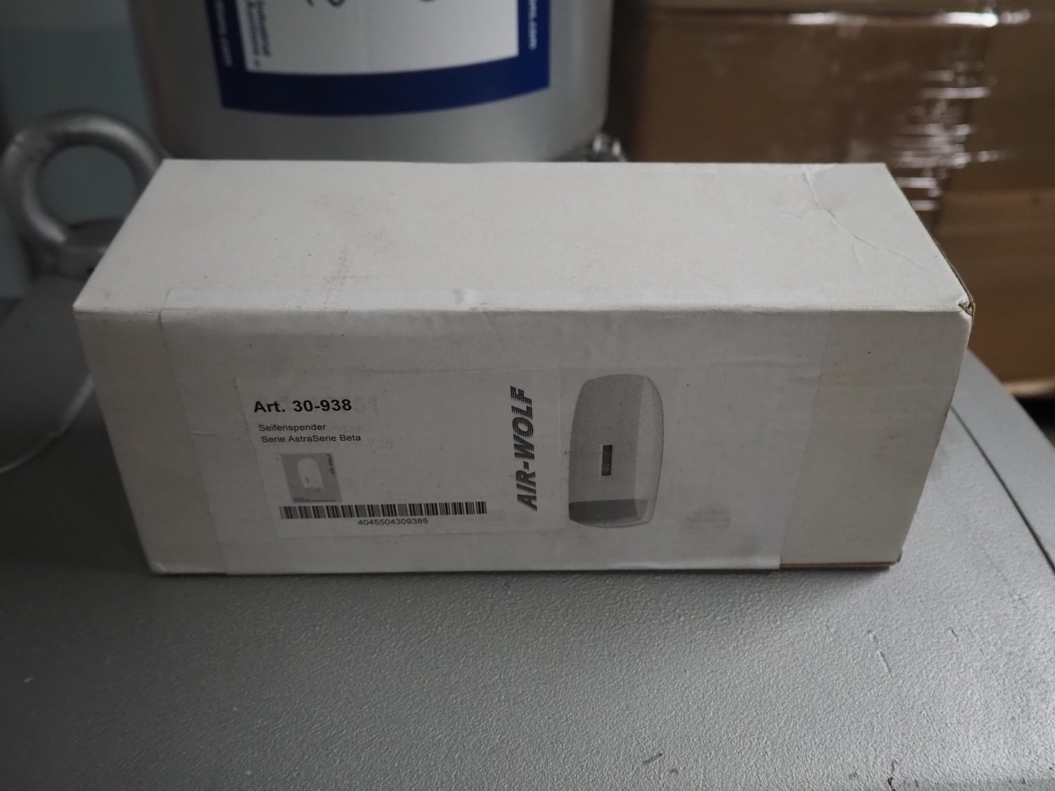 Pallet with 17 boxes with Air-Wolf soap dispensers and s/s sinks, dimensions each dispenser: 290 mm x 110 mm x 110 mm, total dimensions: 1200 mm x 800 mm x 1850 mm.