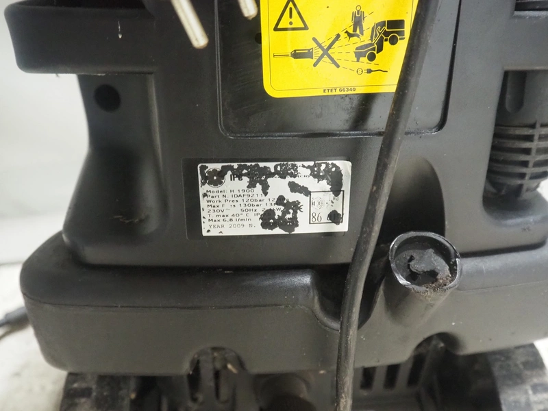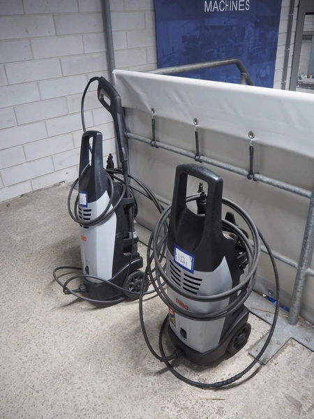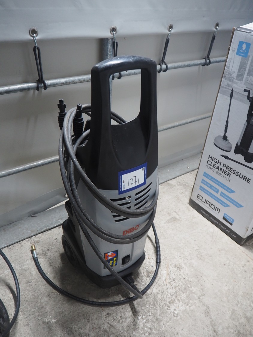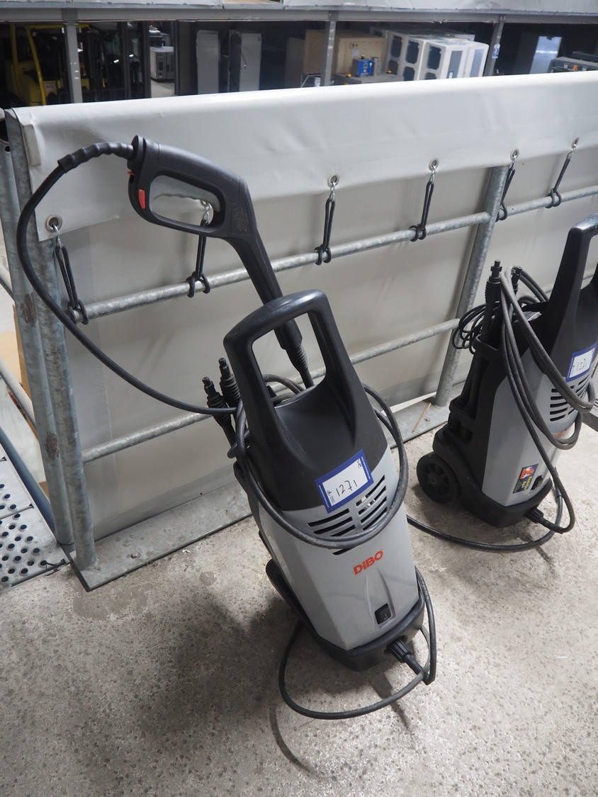 2 Dibo high pressure cleaners, type: H 1900, serial number: 090600092, year of construction: 2009, 230V, 50 Hz, 2.1 kW, 130 bar, 6.8 l/min, dimensions: (2x) 420 mm x 310 mm x 850 mm. Including 1 high pressure lance and 4 spare lance attachments, 1 wheel is broken.
