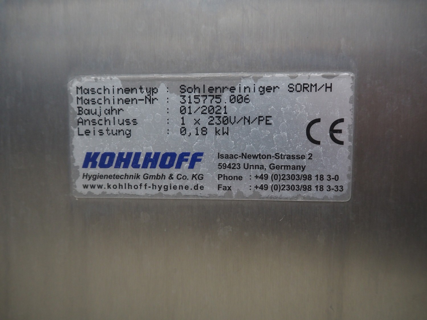 Kohlhoff sole cleaner, type: Sohlenreiniger SORM/H, machine number: 315775.006, year of construction: 01/2021, 230 V, 1 Ph, 0.18 kW, brush length: 300 mm, total dimensions: 550 mm x 530 mm x 1020 mm.