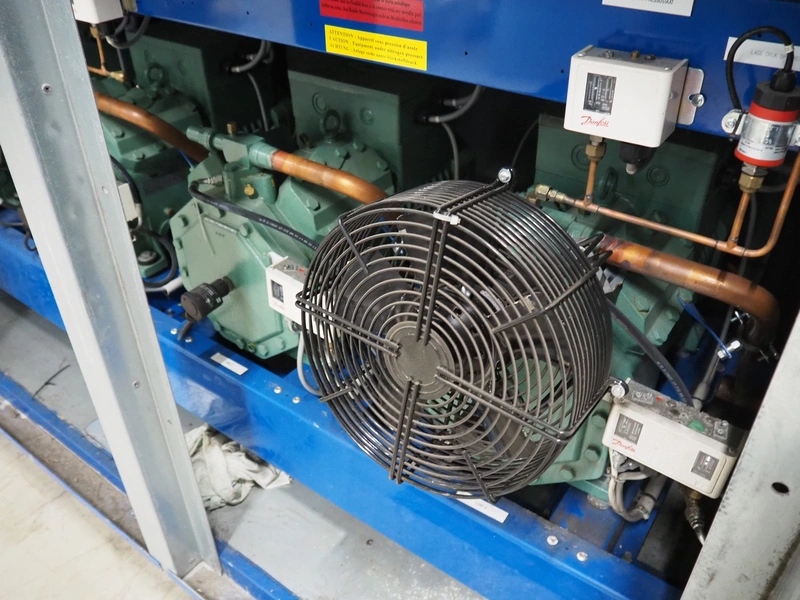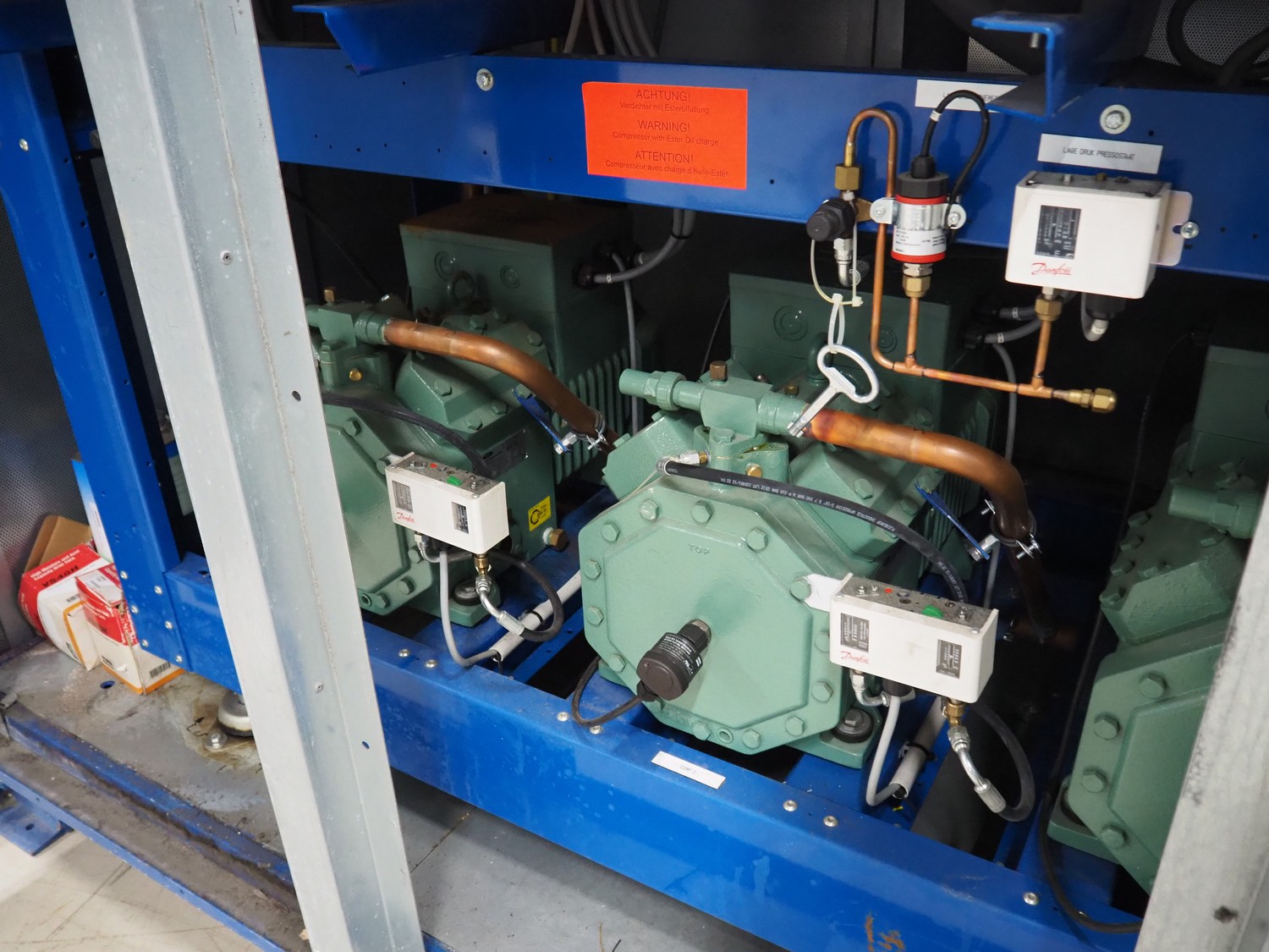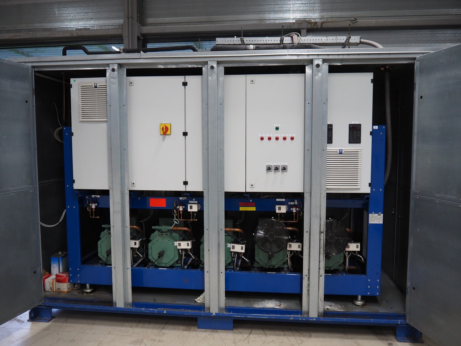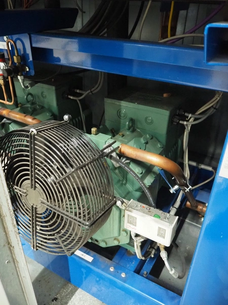 Bitzer Kühlmaschinenbau GmbH compressor rack in cabinet with 5 Bitzer Kühlmaschinenbau GmbH cooling compressors, type: 4NCS-12.2Y-40P, dimensions: 3600 mm x 1700 mm x 2500 mm.