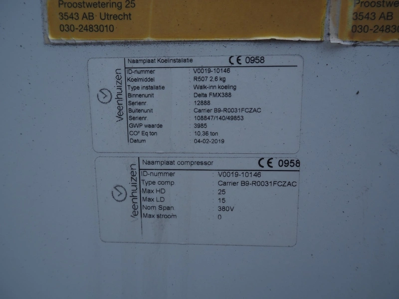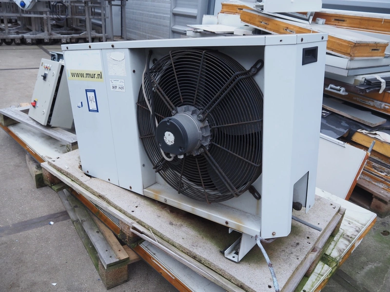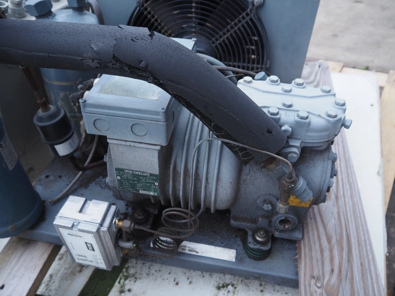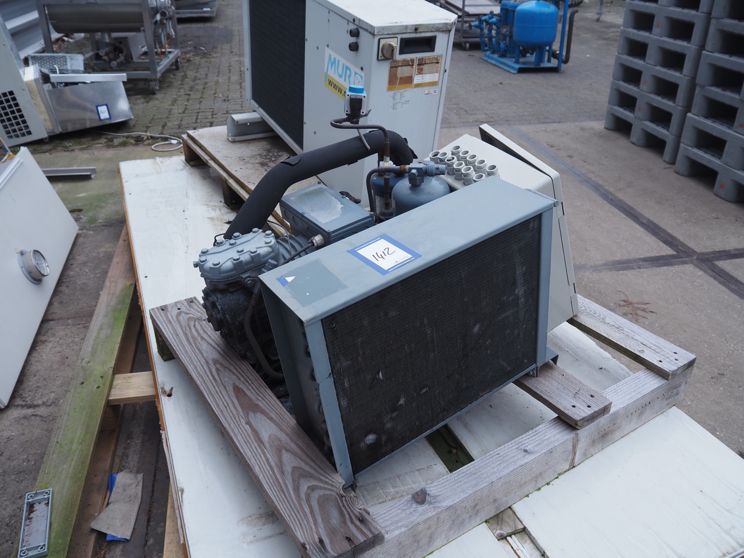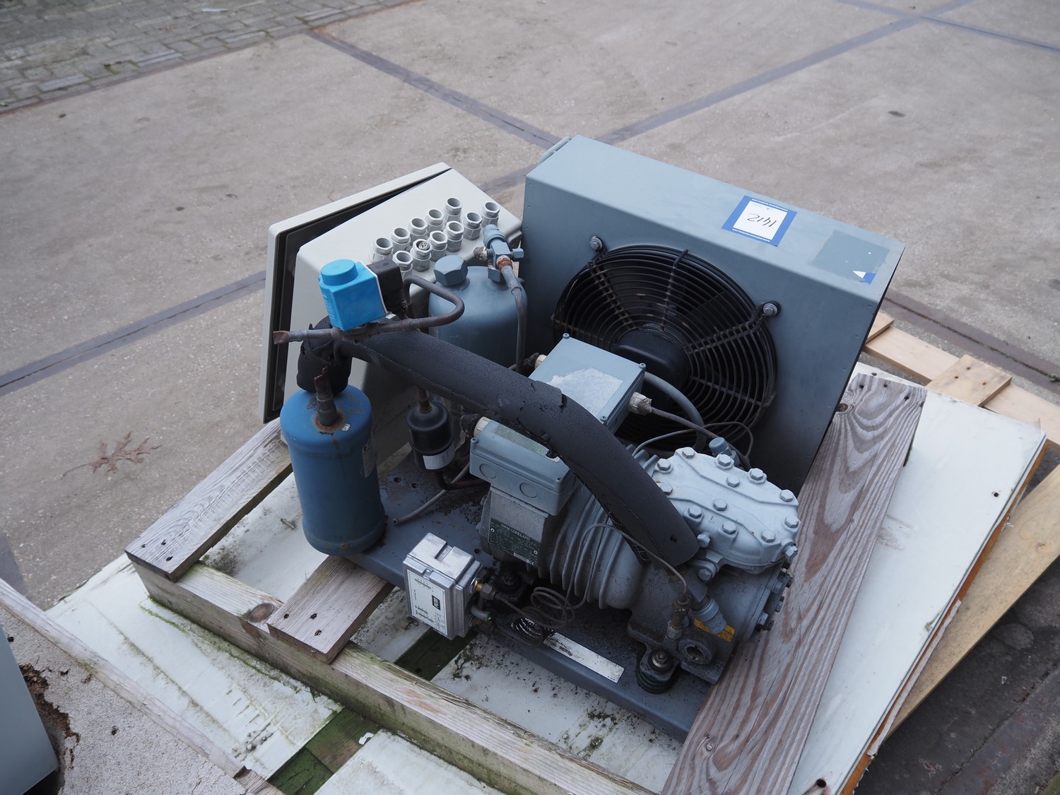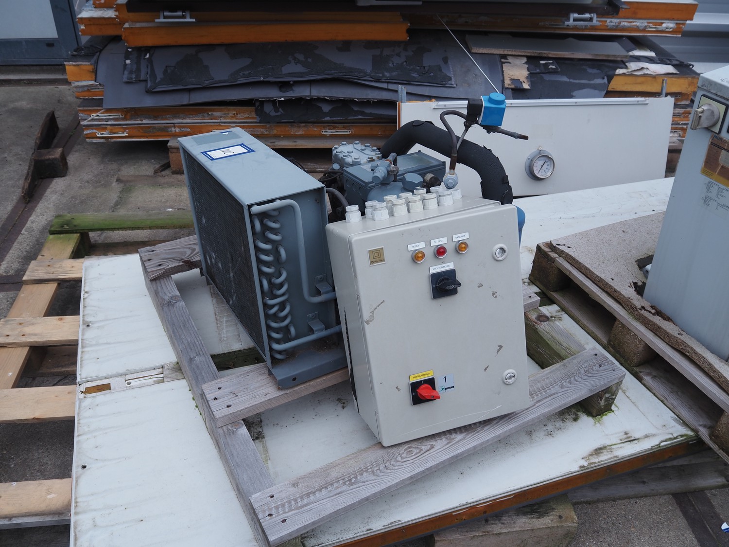 Cooling cell with Profoid condensing unit and DWM Copeland cooling compressor, type condensing unit: B90-R0031FCZAC, serial number: 108847/140/49853, year of construction: 2006, 400 V, 3 Ph, 50 Hz, dimensions: 1295 mm x 740 mm x 760 mm, type cooling compressor: DKLP-15X-EWL, serial number: 08G000949 M, capacity: 7.35 m³ per hour, dimensions: 840 mm x 930 mm x 540 mm, dimensions pallets with cooling panels: (1x) 2600 mm x 1200 mm x 300 mm, (1x) 3060 mm x 1350 mm x 1020 mm.