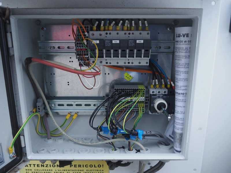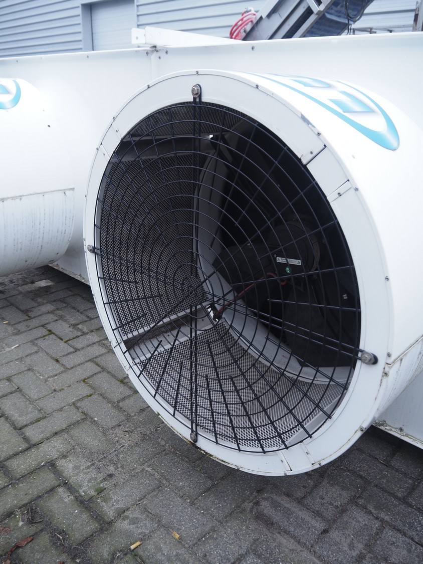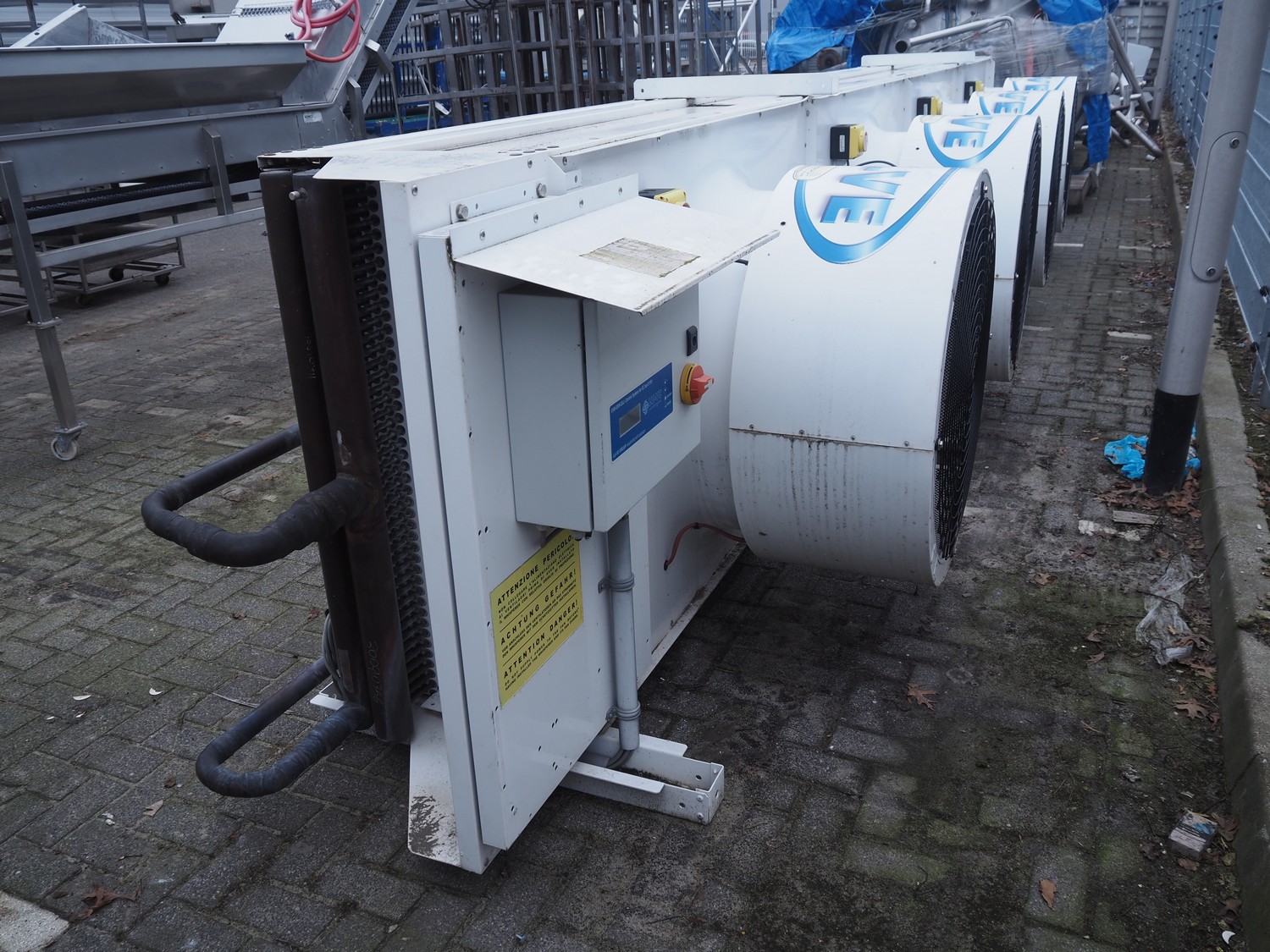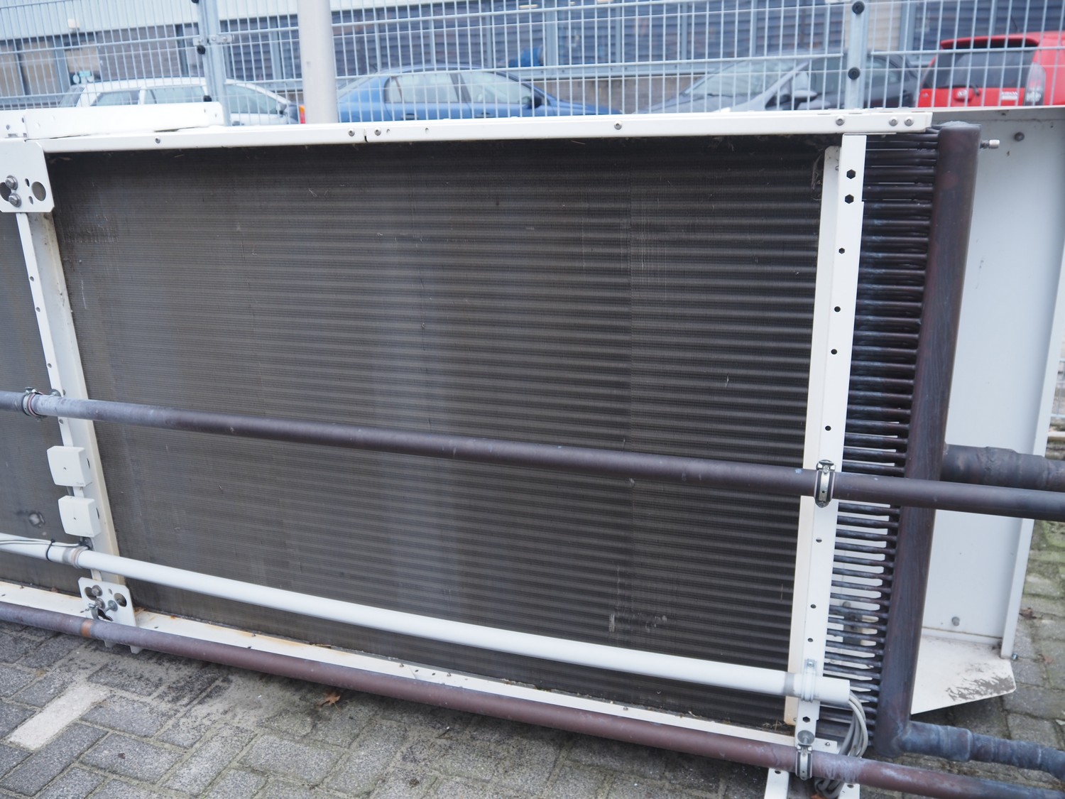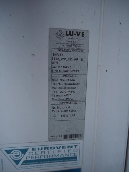 LU-VE S.p.A. condenser, model: SAV8T, serial number: 5335890, year of construction: 2019, 400 V, 50 Hz, 1.4 A, 840 W, refrigerant: R22-R134a-R407C-R404A-R507, volume: 86 dm³, 4 fans, dimensions: 6930 mm x 1350 mm x 1200 mm.