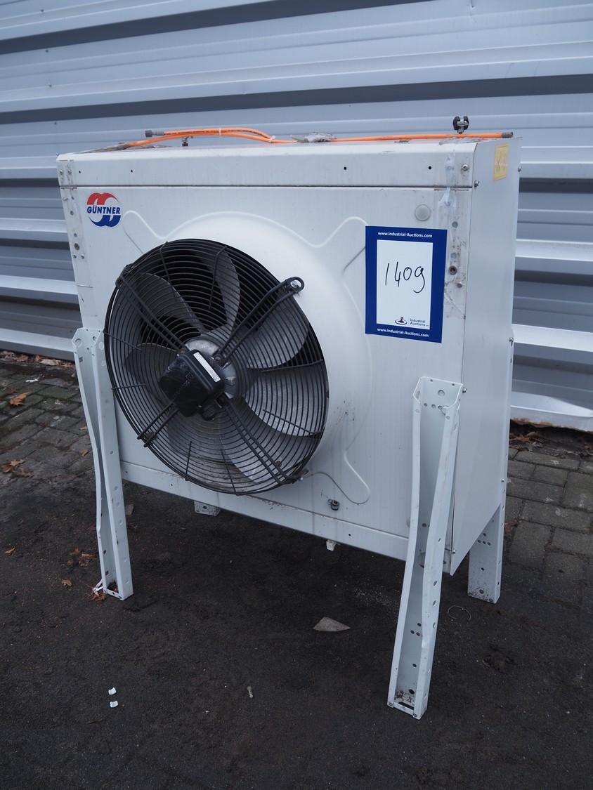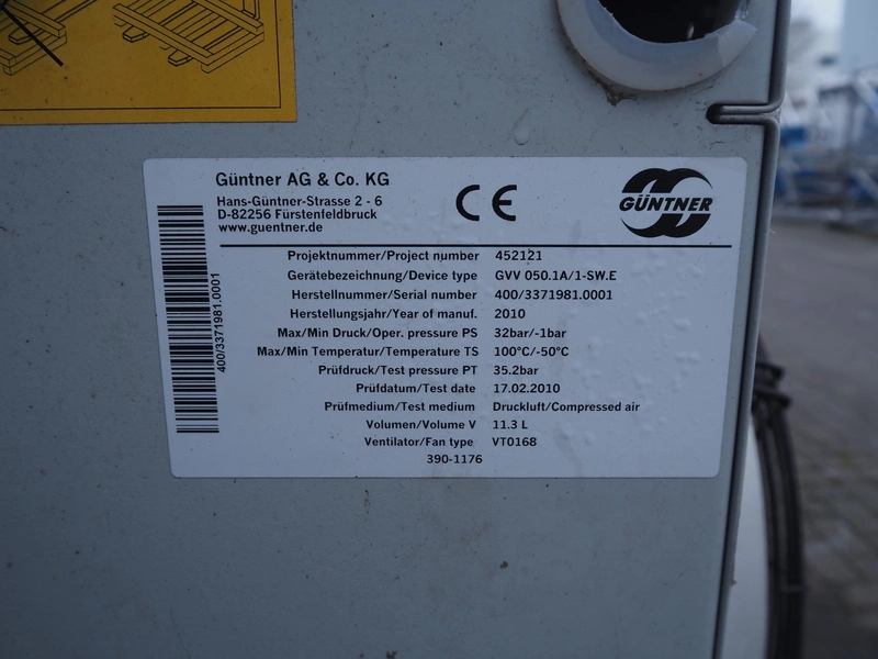 Güntner AG & Co. KG condenser, 1 fan, type: S-GVV 050.1A/1-SW.E, serial number: 400/3371981.0001, year of construction: 2010, air pressure: 35.2 bar, volume: 11.3 liter, dimensions: 1040 mm x 600 mm x 1140 mm.