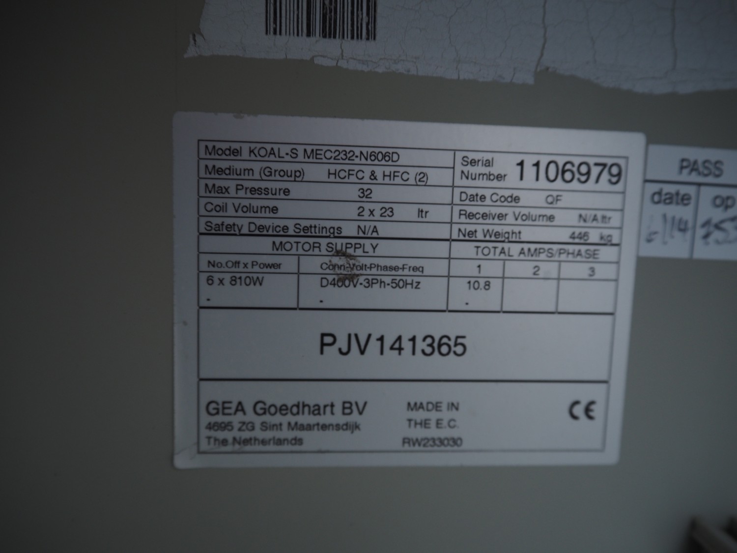 GEA Goedhart BV roof condenser, 6 fans, model: KOAL-S MEC232-N606D, serial number: 1106979, dimensions: 3950 mm x 2070 mm x 1000 mm.