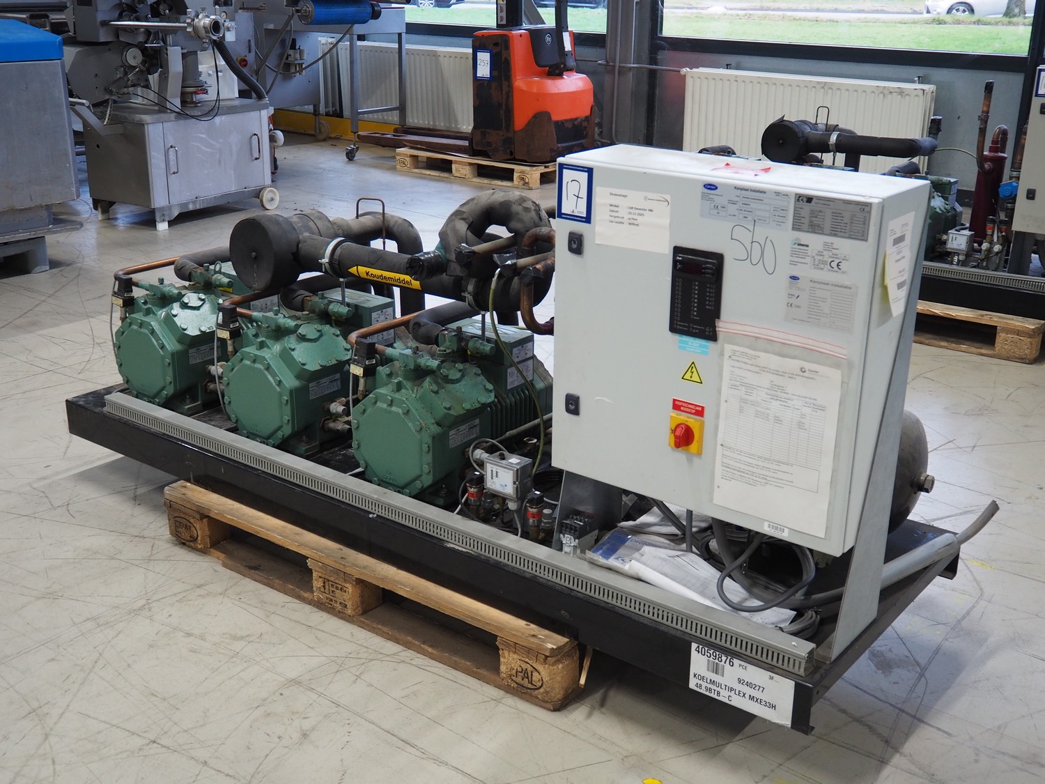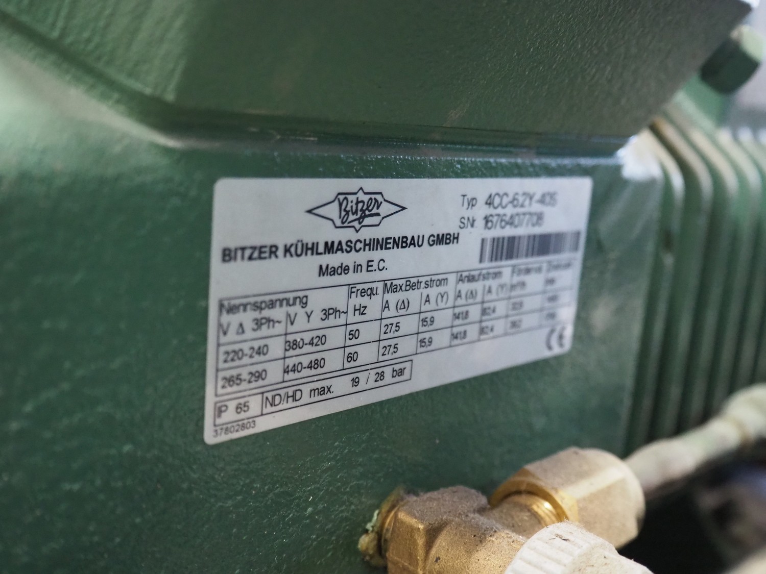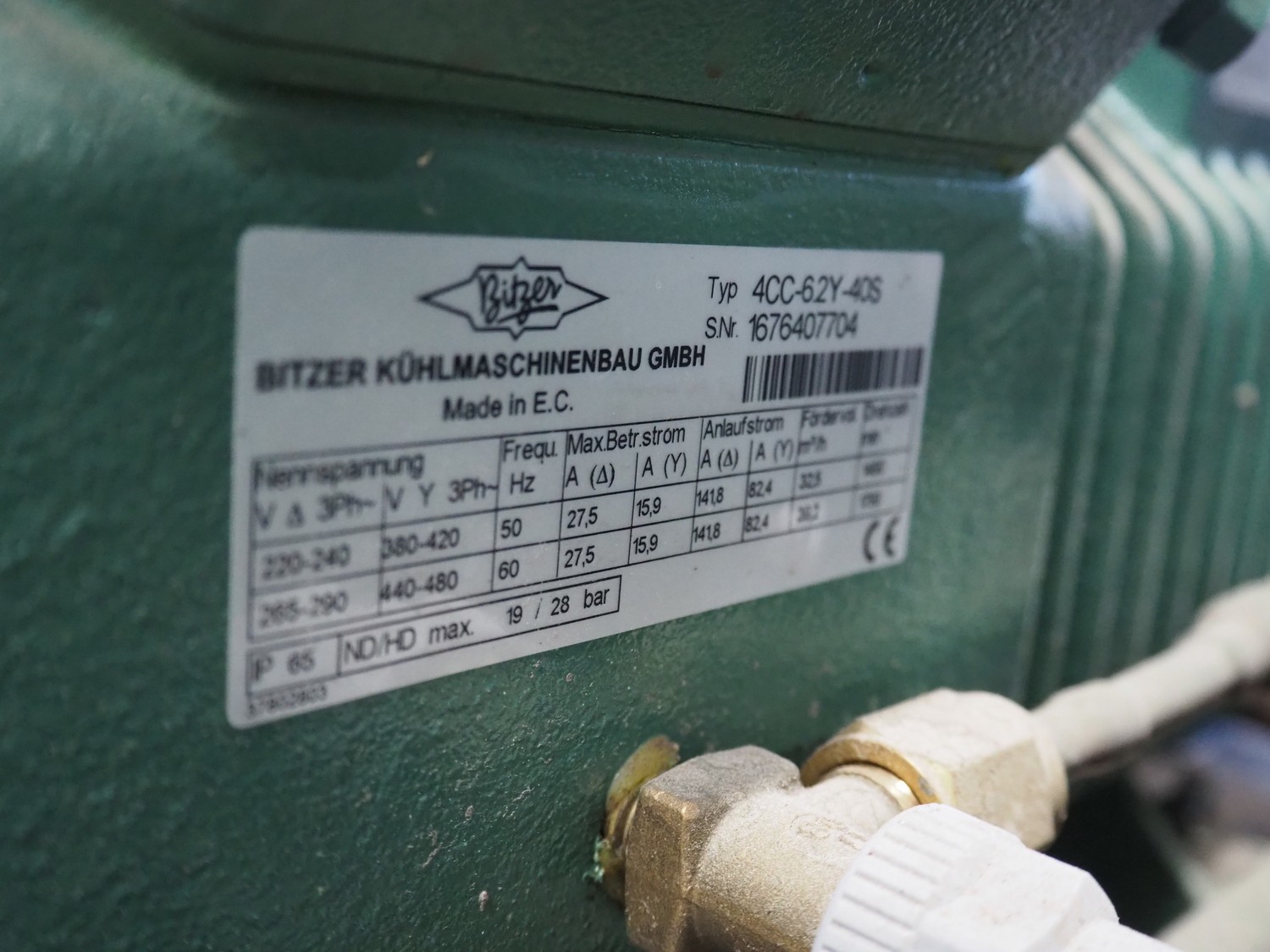 Bitzer Kühlmaschinenbau GmbH compressor rack in cabinet with 3 Bitzer Kühlmaschinenbau GmbH cooling compressors, type: (3x) 4CC-6.2Y-40S, capacity: 32.5/38.2 m³ per hour, dimensions: 900 mm x 2200 mm x 1100 mm.