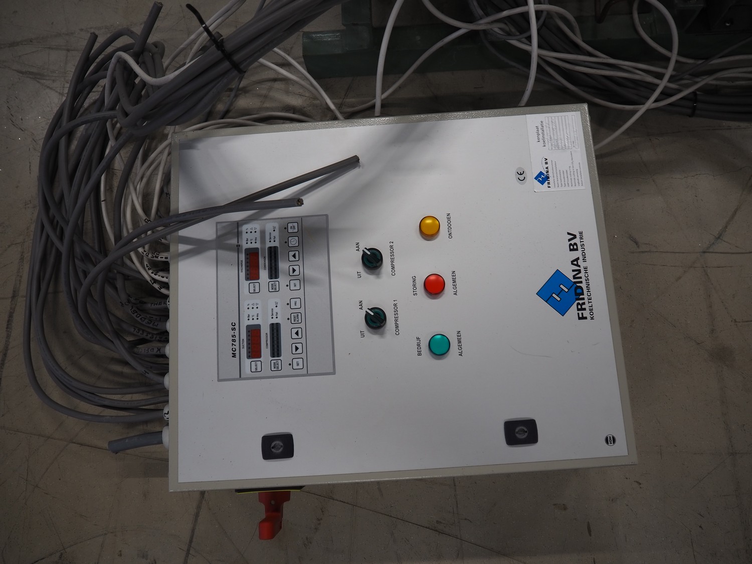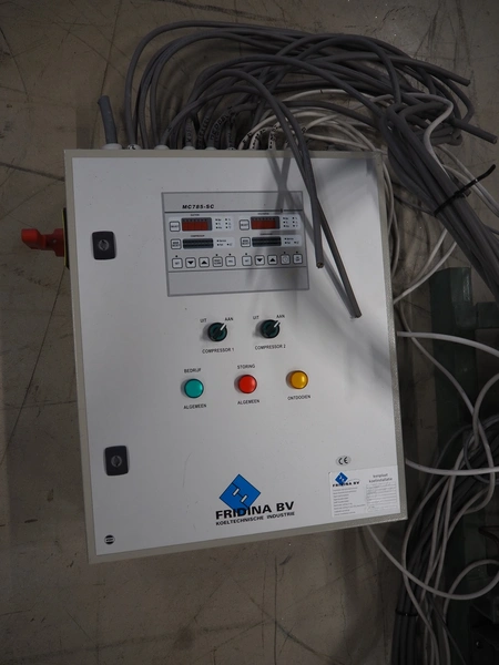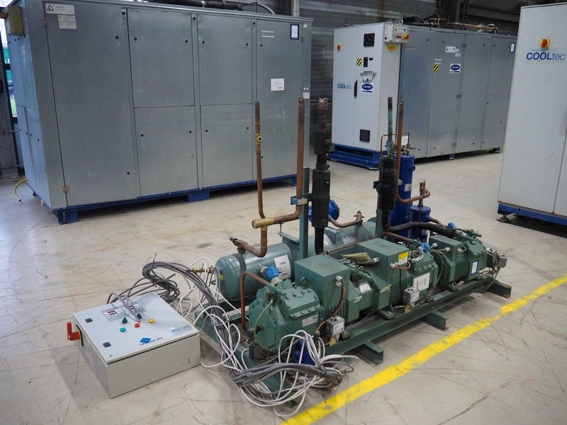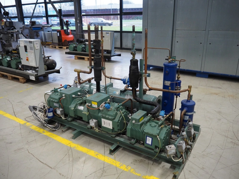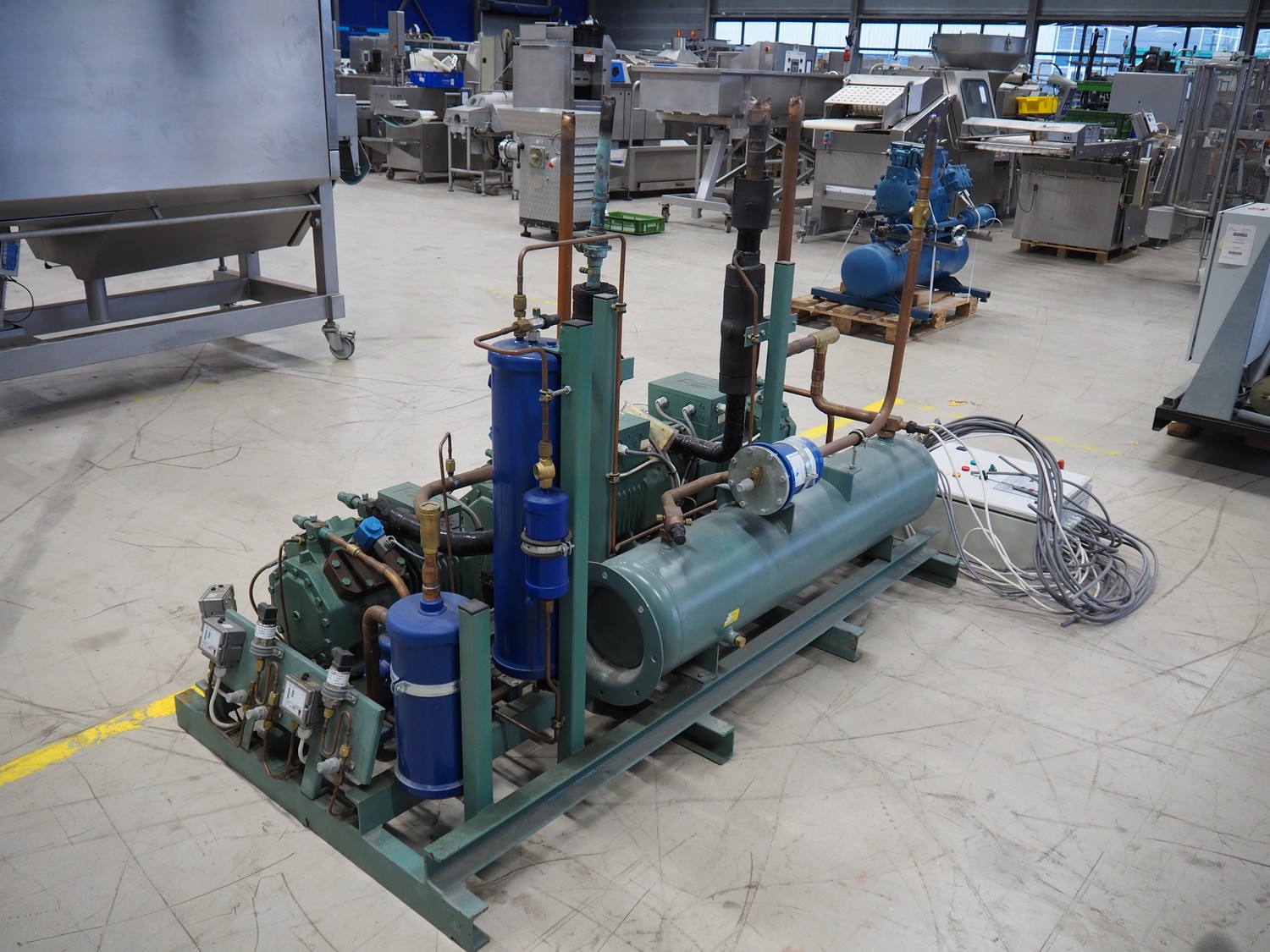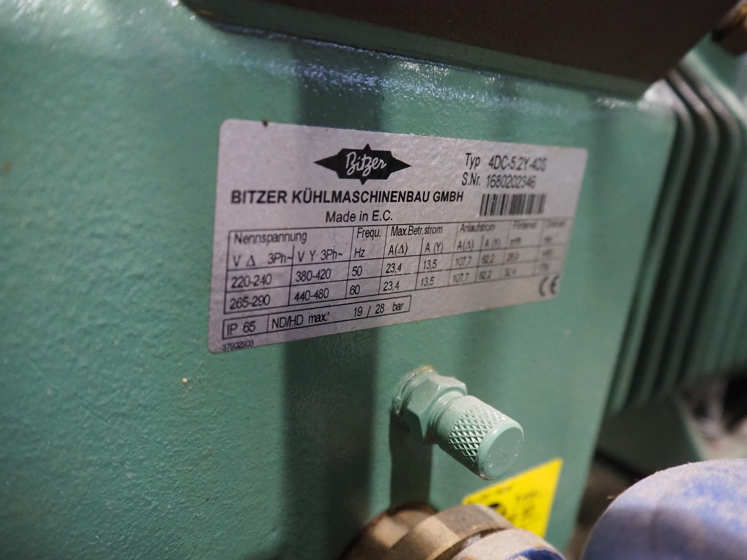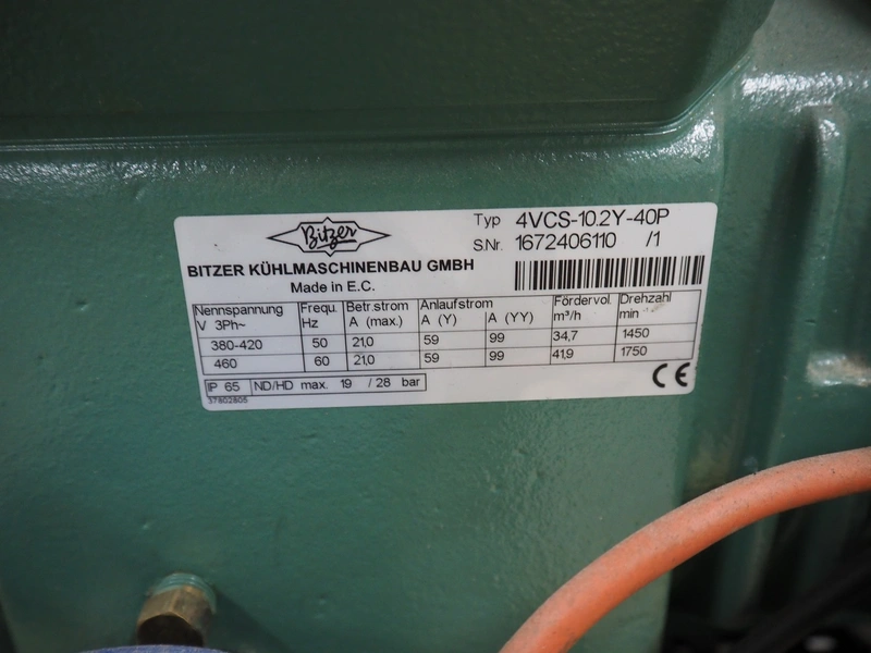 Bitzer Kühlmaschinenbau GmbH compressor rack in cabinet with 3 Bitzer Kühlmaschinenbau GmbH cooling compressors, type: 4DC-5.2Y-40S and (2x) 4VCS-10.2Y-40P, capacity: 26.8/32.4 m³ per hour and (2x) 34.7/41.9 m³ per hour, dimensions: 1000 mm x 2000 mm x 1500 mm.