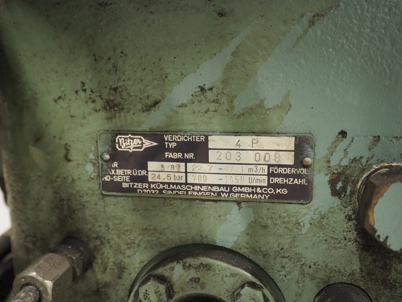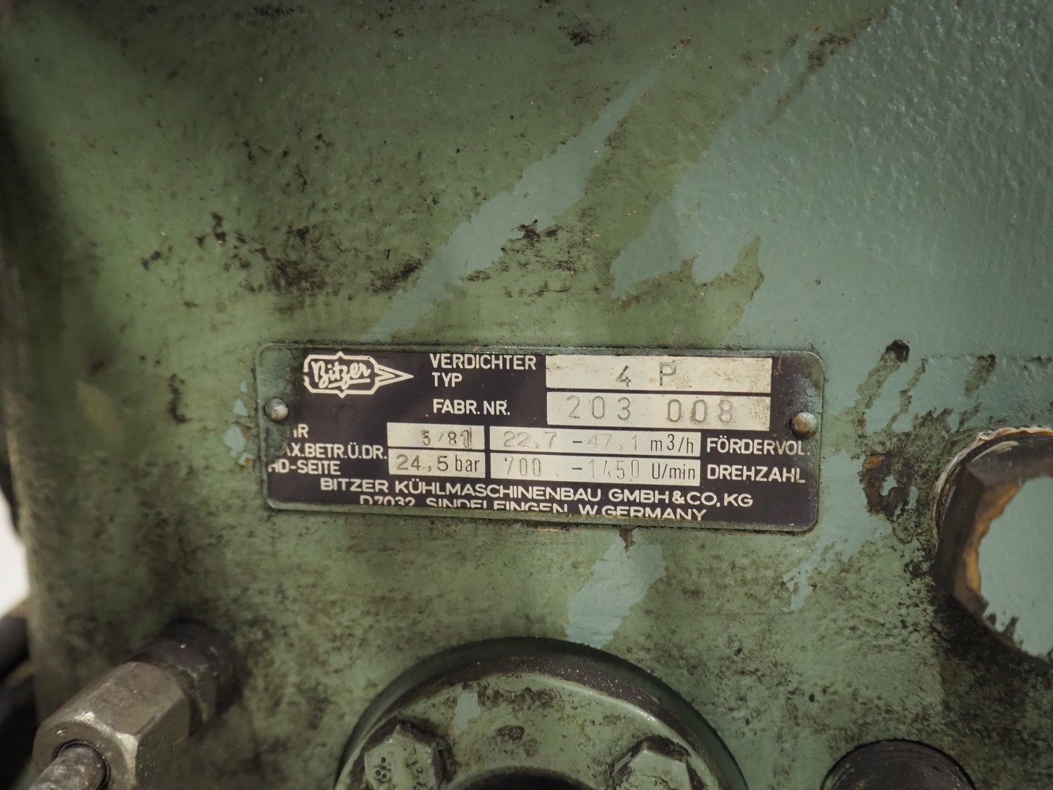 Bitzer Kühlmaschinenbau GmbH cooling compressor, type: 4P, fabrication number: 203 008, capacity: 22.7-47.1 m³ per hour, dimensions: 1200 mm x 1000 mm x 900 mm.
