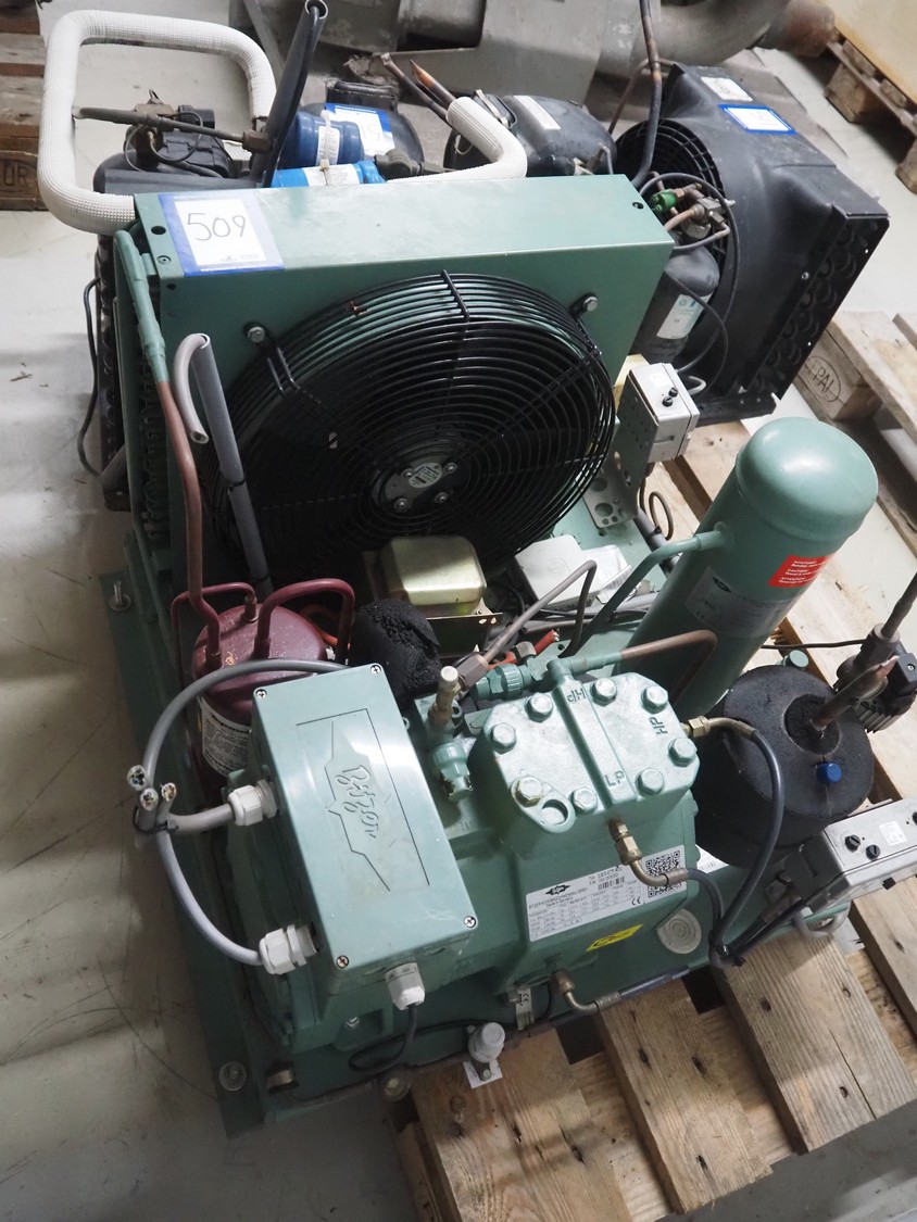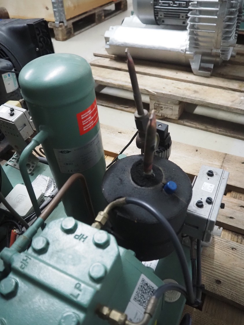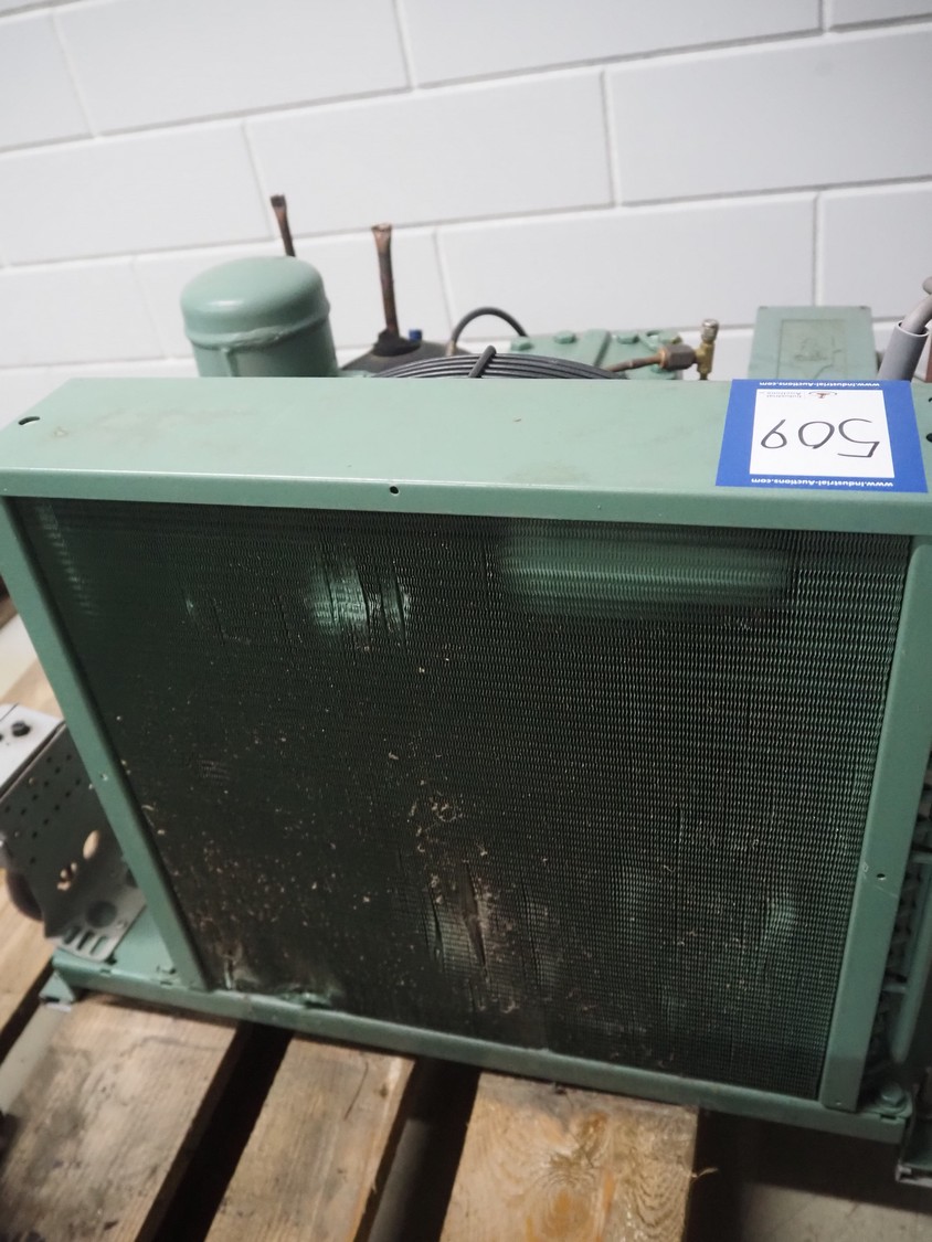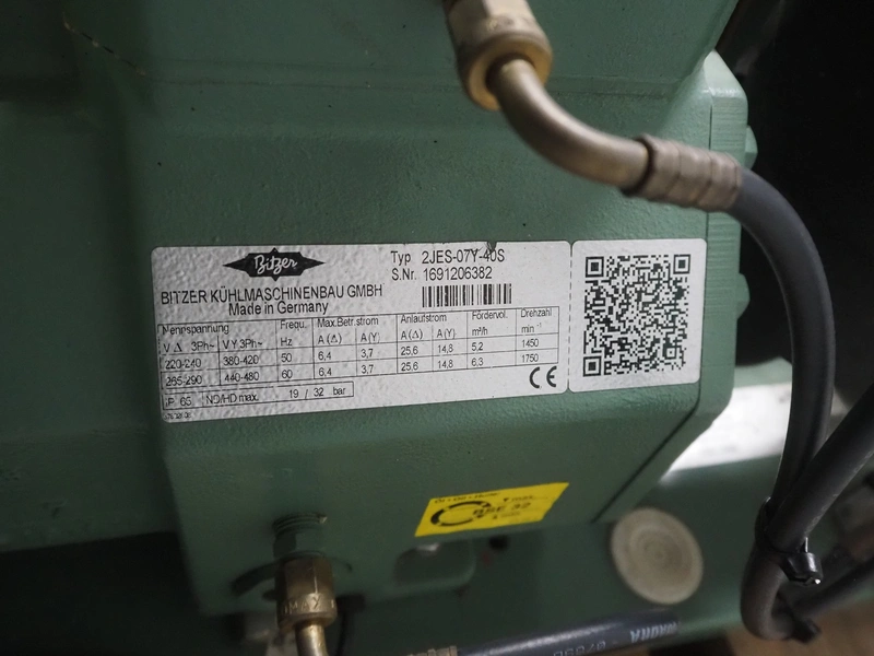 Bitzer Kühlmaschinenbau GmbH cooling compressor with condenser, type: 2JES-07Y-40S, serial number: 1691206382, capacity: 5.2/6.3 m³ per hour, dimensions: 650 mm x 550 mm x 500 mm.