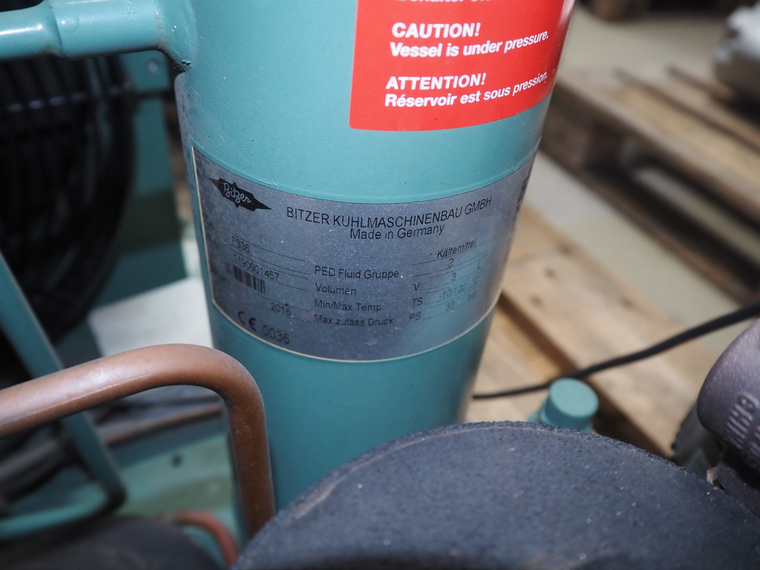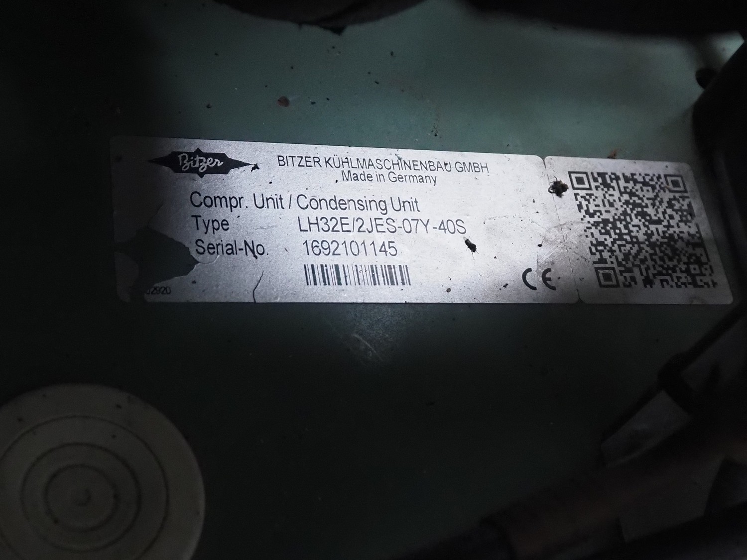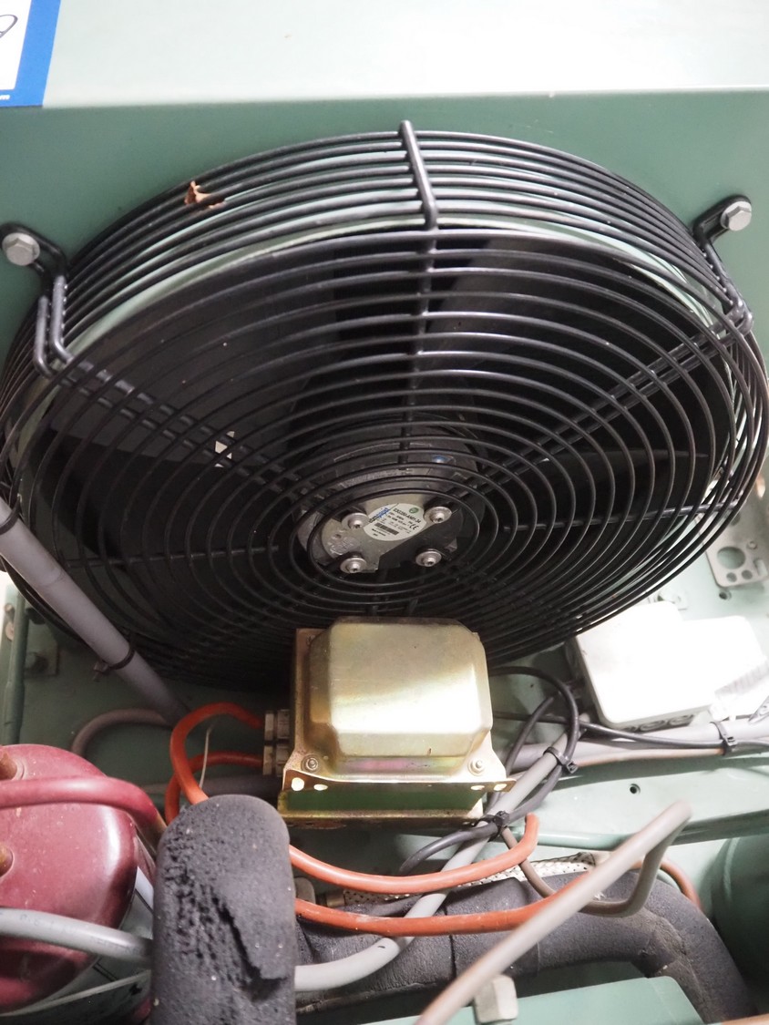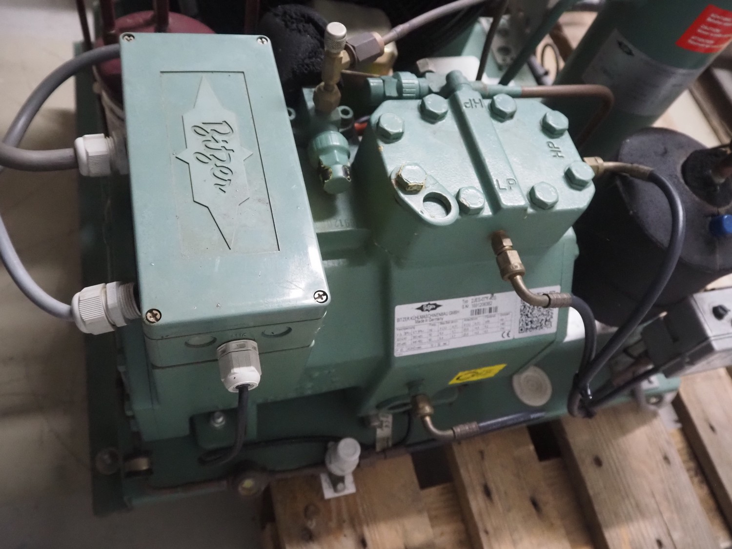 Bitzer Kühlmaschinenbau GmbH cooling compressor with condenser, type: 2JES-07Y-40S, serial number: 1691206382, capacity: 5.2/6.3 m³ per hour, dimensions: 650 mm x 550 mm x 500 mm.