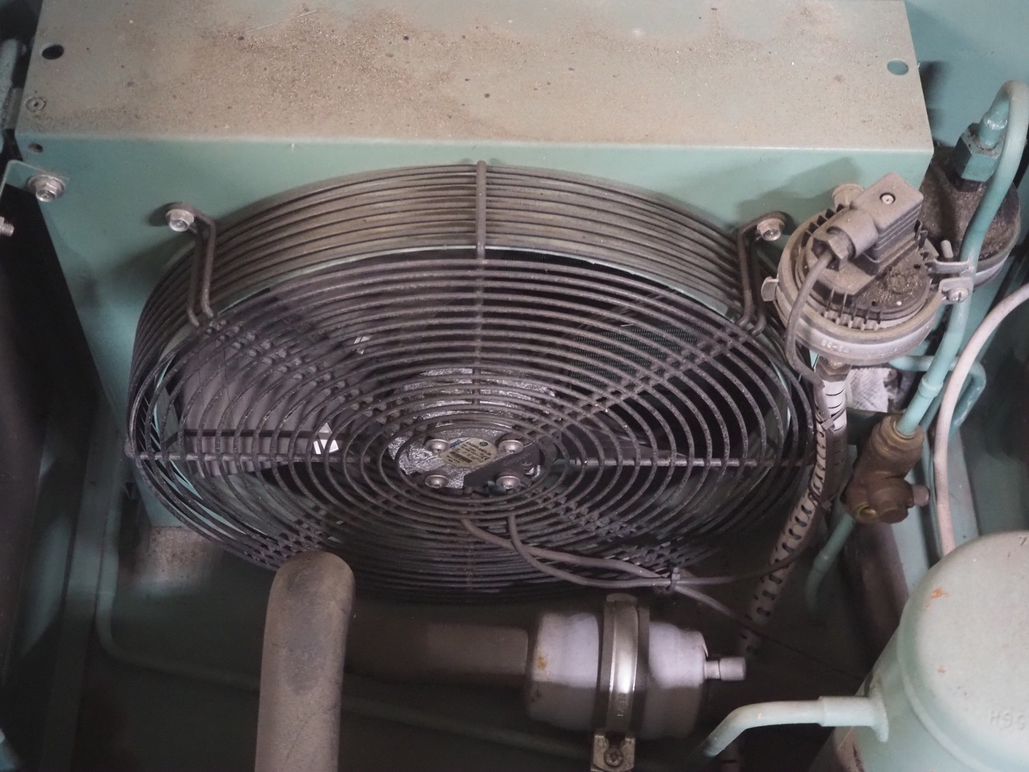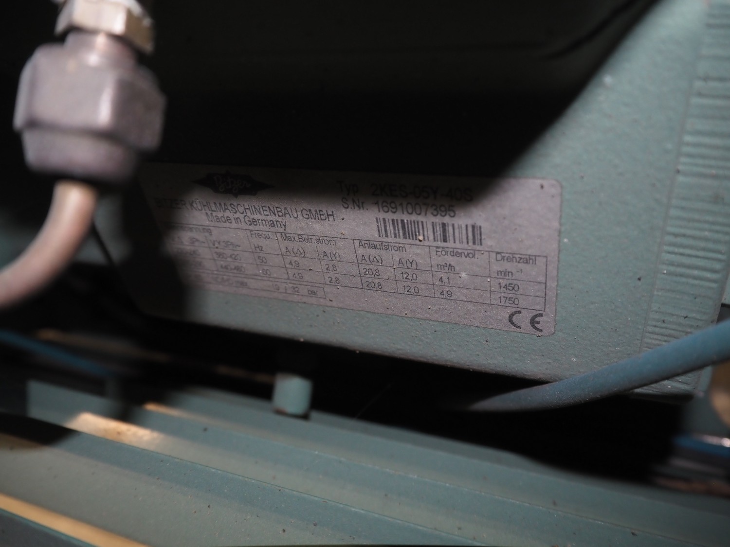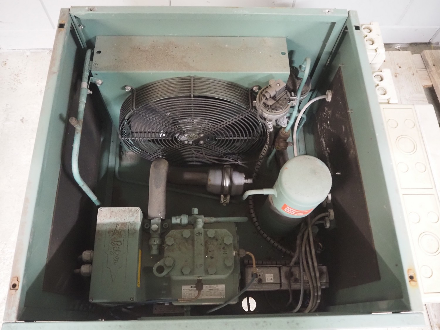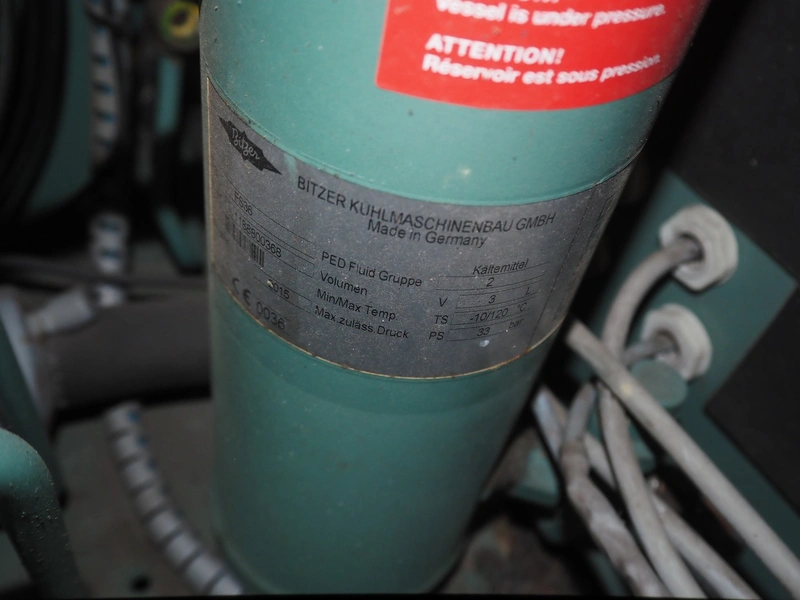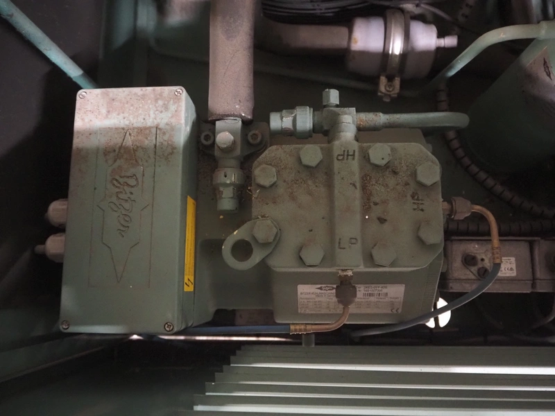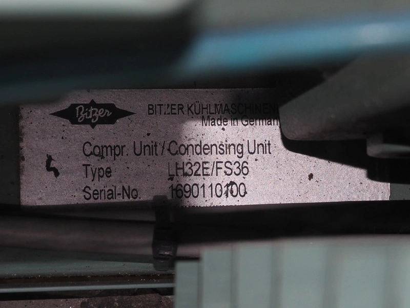 Bitzer Kühlmaschinenbau GmbH condensing unit with cooling compressor, type: 2KES-05Y-40S, capacity: 4.1/4.9 m³ per hour, dimensions: 850 mm x 850 mm x 600 mm.