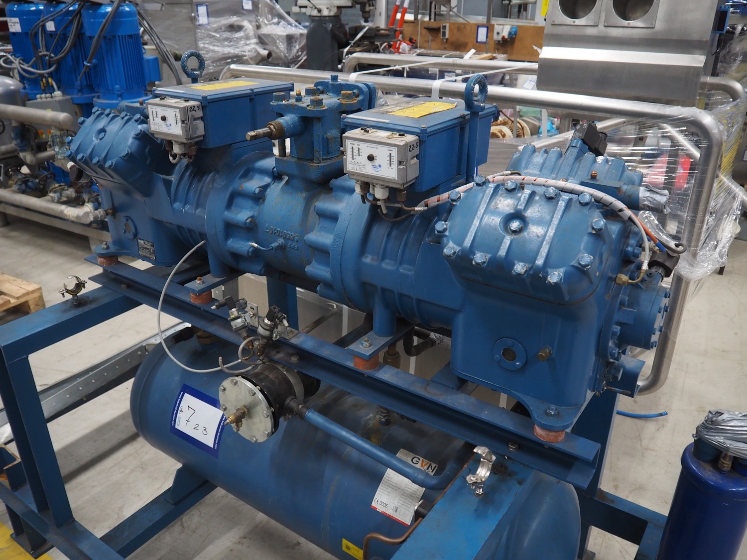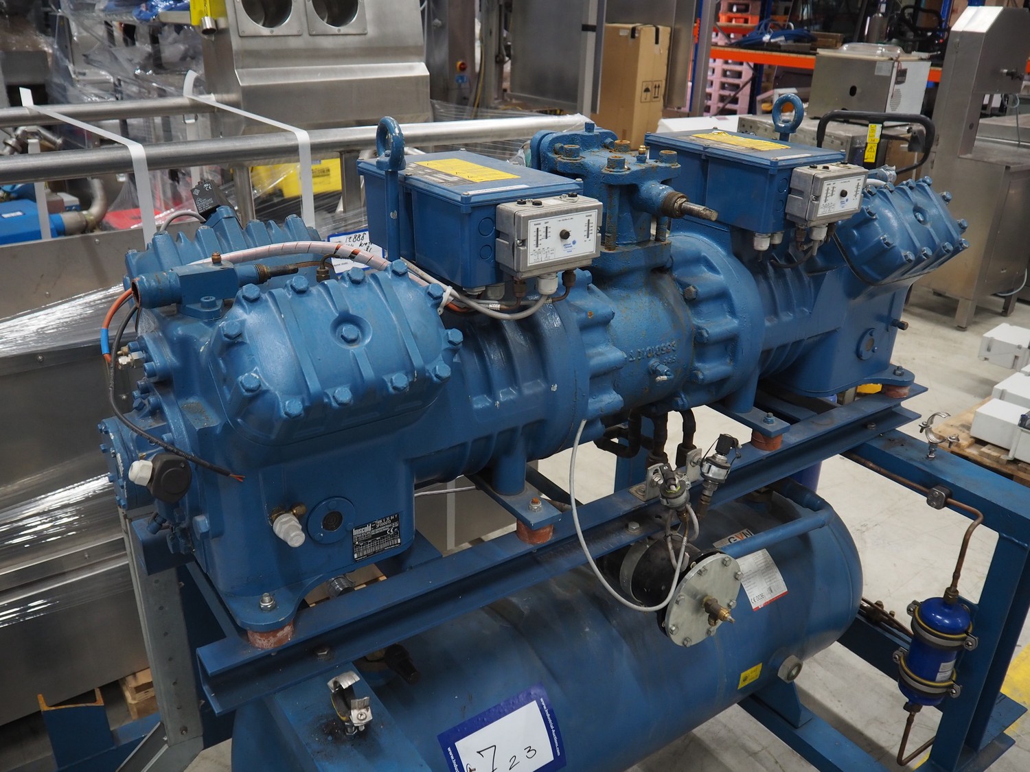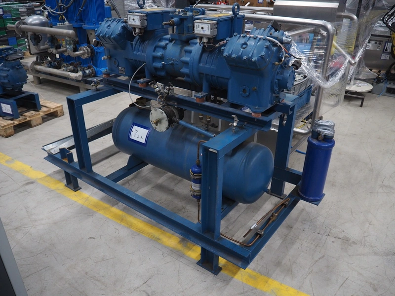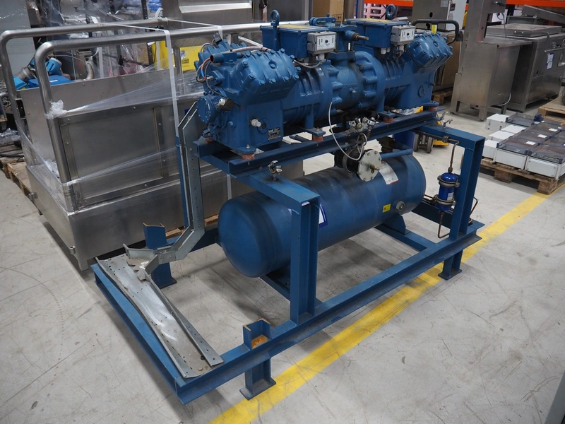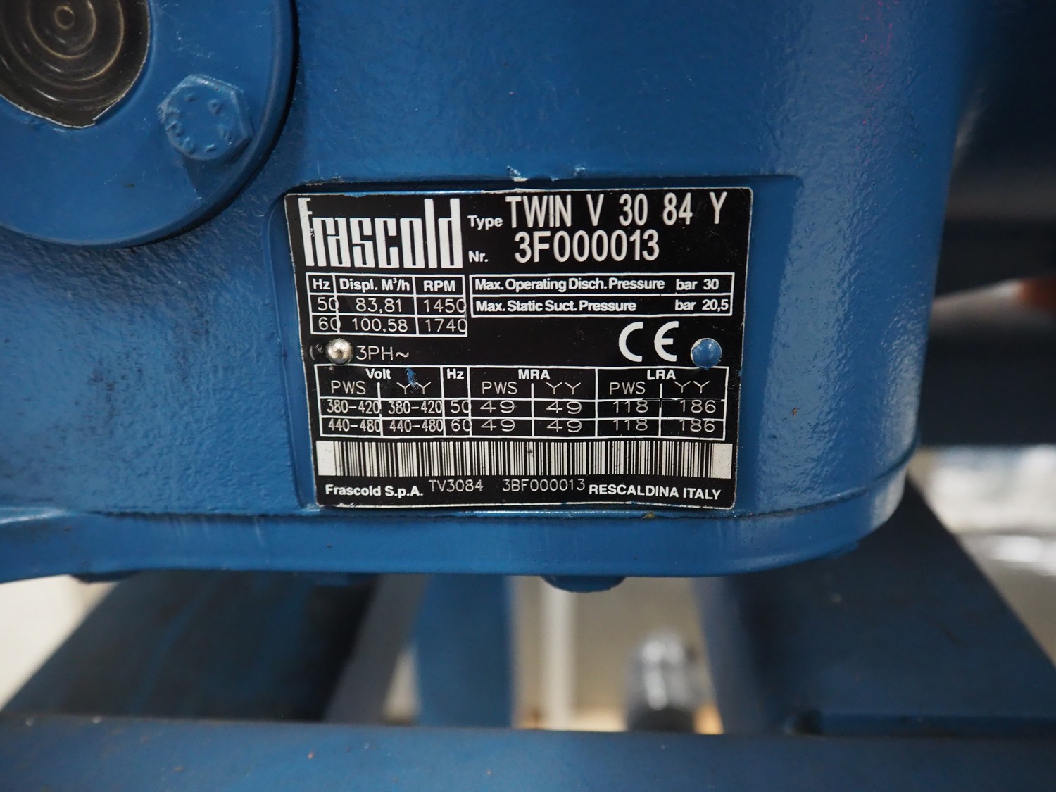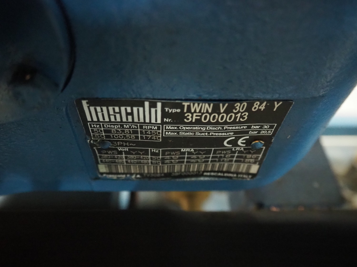 Frascold S.P.A. compressor rack, type compressor: TWIN V 30 84 Y, number: 3F000013, 50/60 Hz, 3 Ph, capacity: 83.81 / 100.58 m³ per hour, 1450 / 1740 rates per minute, total dimensions: 1800 mm x 1100 mm x 1970 mm.